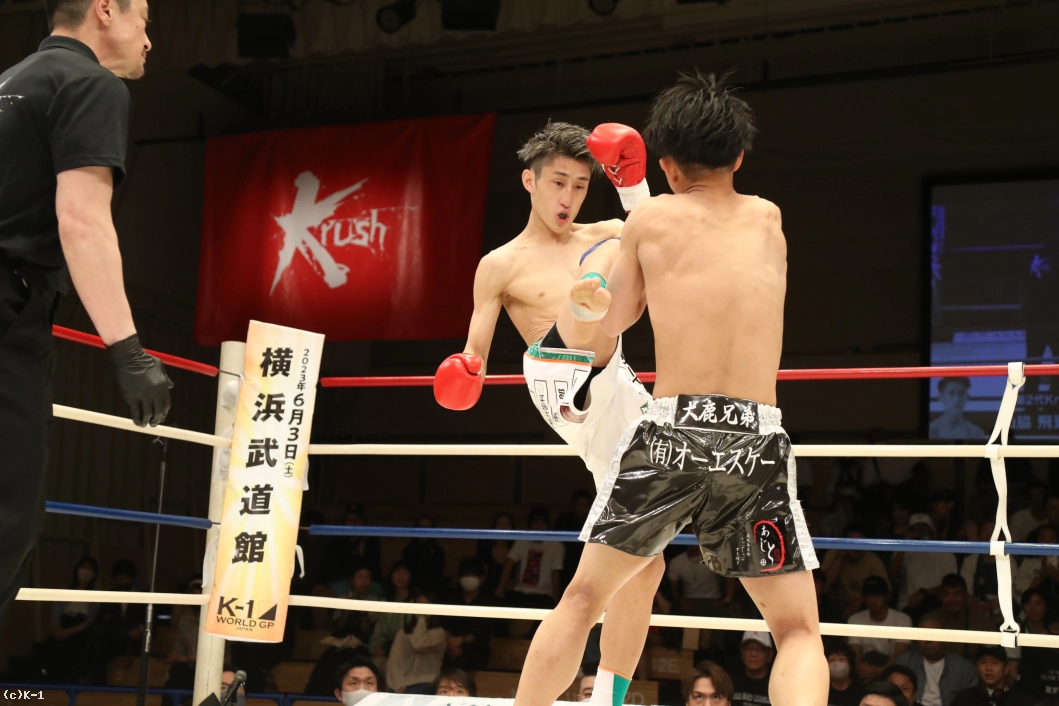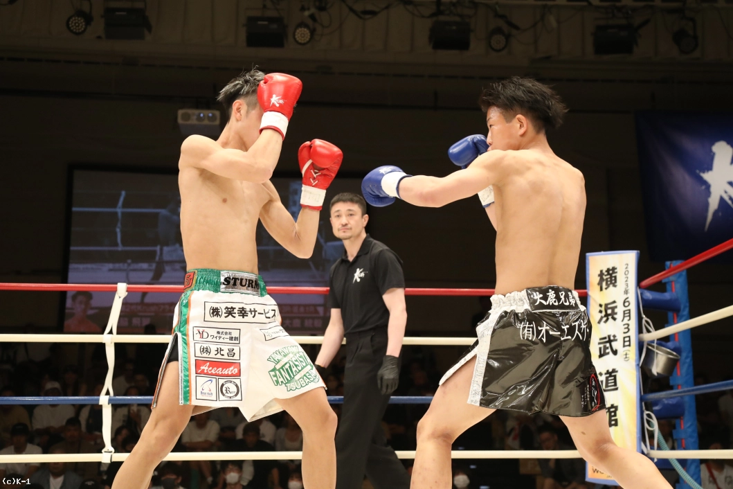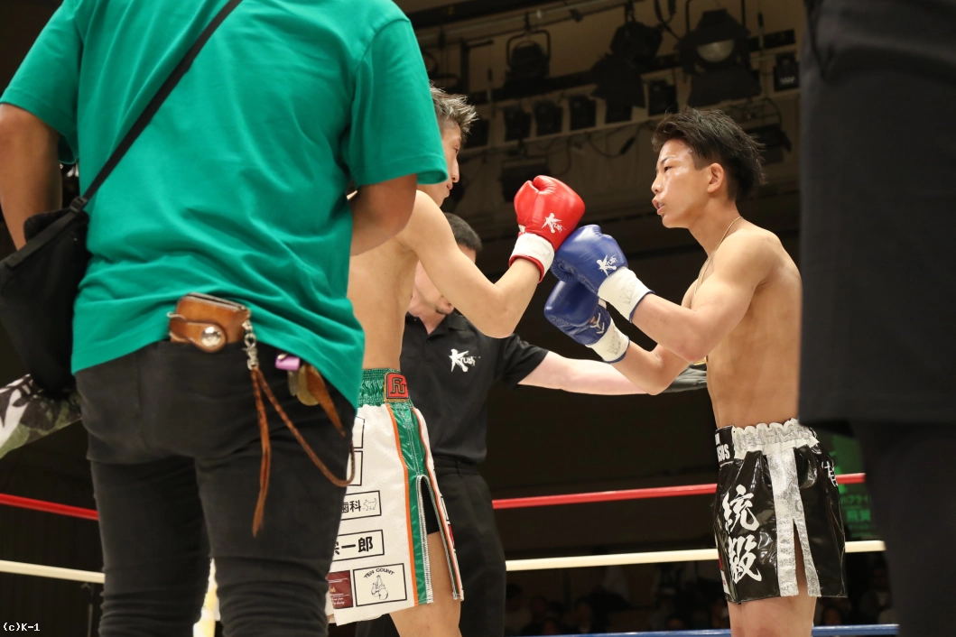 1R、両者探り合いの状態から、大鹿が鋭いワンツーを打ち込んで山脇からダウンを奪う。立ち上がった山脇に対し、大鹿はボディ打ちを交え、左フック・右ストレートと連打。再び倒れる山脇だが、これはスリップの判断。しかし大鹿の勢いは衰えず、左ボディフック、左フックから右フックを打ち込み、山脇からダウンを奪って初回KOで準決勝を突破した。