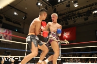2R、ジャブから前に出る倉田。奥足への三日月蹴りいわゆる与座キックを当てる。迅も下がりながら左フックを打ち返し、倉田と同じように奥足を蹴って、ボディを狙ってミドルとヒザ蹴りを突き刺す。