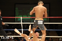 1R、倉田がワンツーから左ミドル、右ローにつなげる。迅はジャブを返して右ローを蹴り返す。倉田はじわじわとプレッシャーをかけて、パンチを顔とボディに打ち分ける。終了間際、倉田は迅の蹴りに右ストレートを合わせてダウンを奪う。