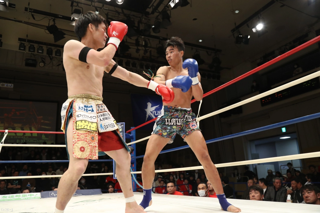 1R、まずはデンサヤームが右のミドルキック。だが、下がらない町田は前に出ていく。しかし、デンサヤームの前蹴りが炸裂。さらに左のミドルキックを連打だ。だが、町田は前蹴りで前に出て下がらない。デンサヤームは下がりながらもパンチを打ってから左ミドルキックを的確に当てていく。