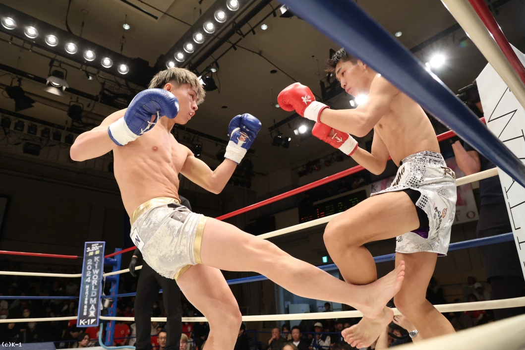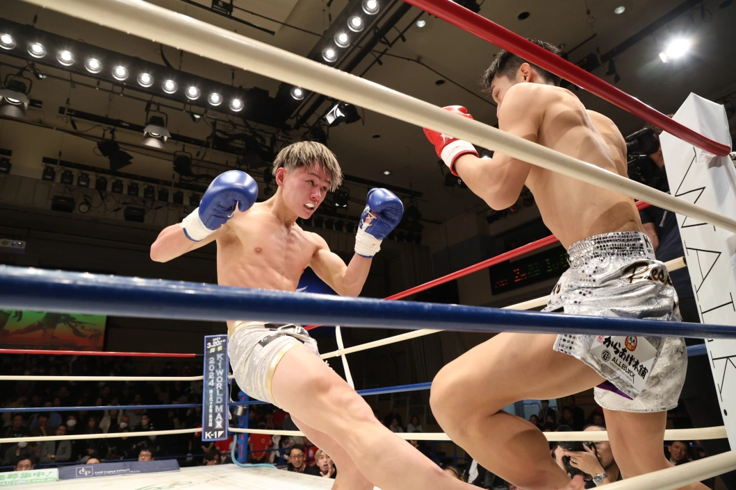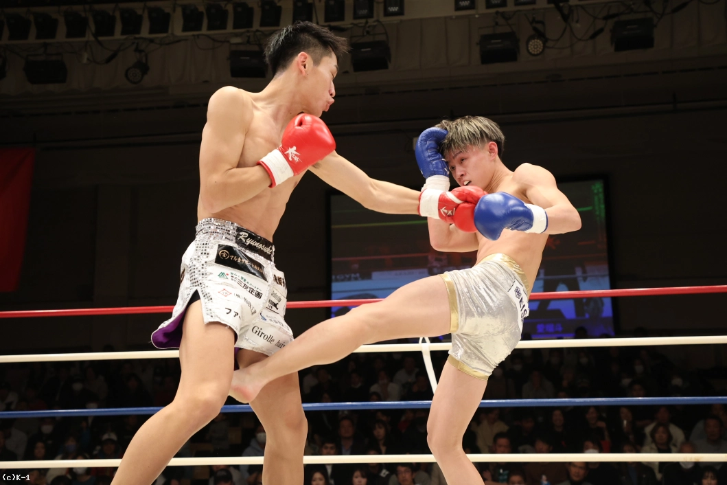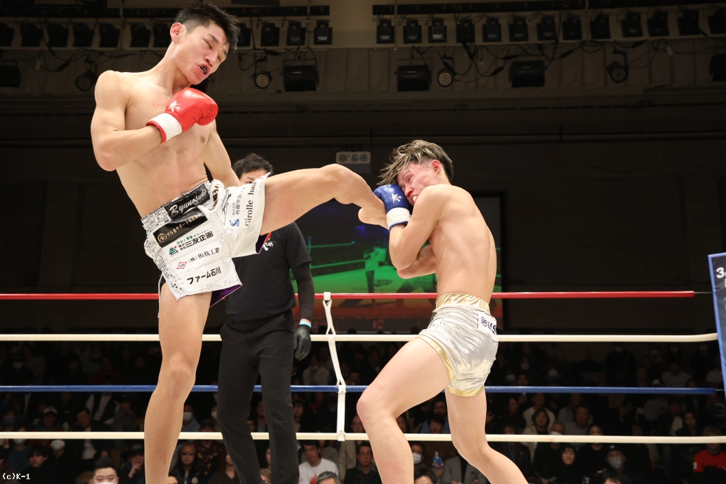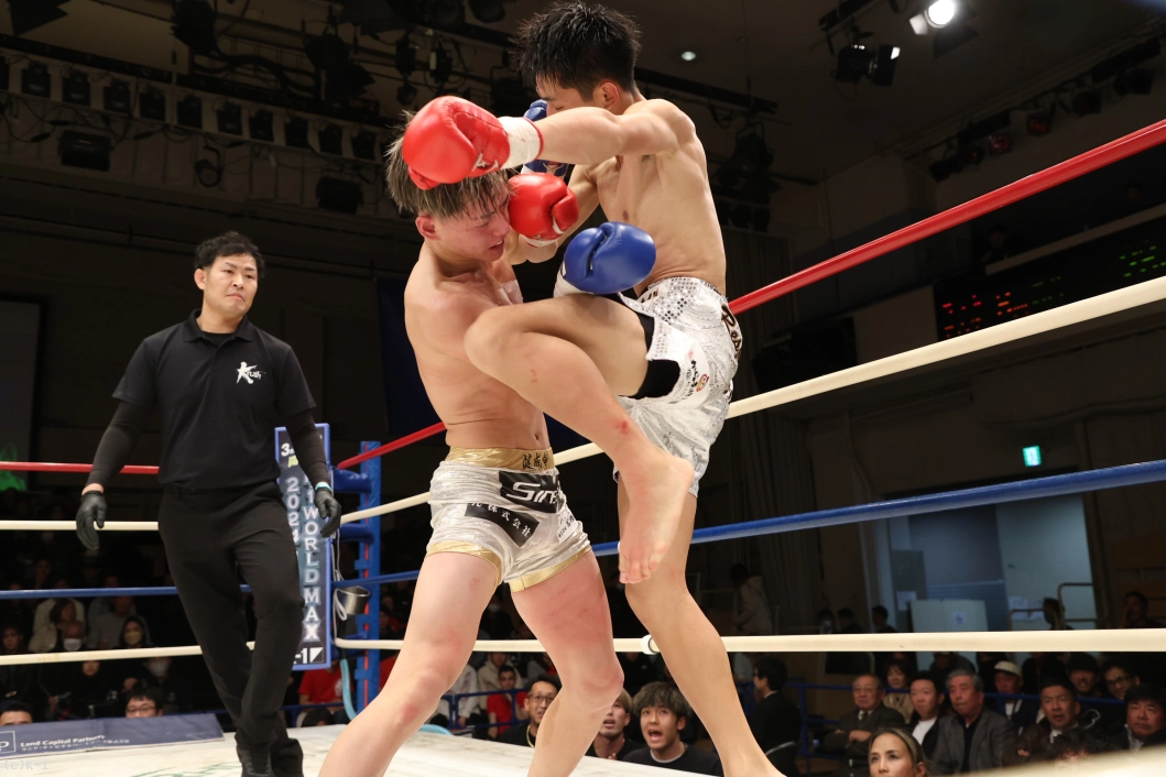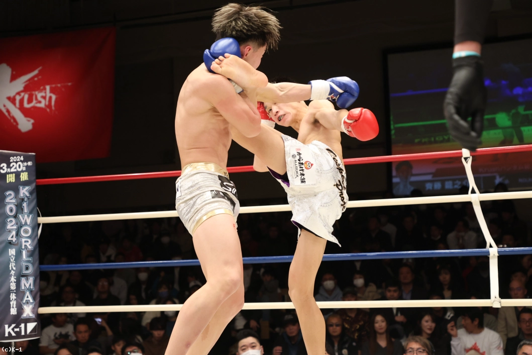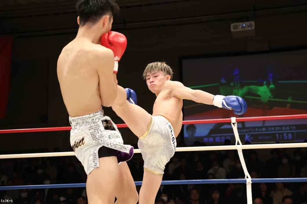 1R、いきなり右のハイキックを繰り出した齊藤。さらに左のミドルを繰り出す。それに対して愛瑠斗は「打ってこい」と挑発しつつ前に出ていく。ならばと齊藤は右のミドルキック。さらに右のハイキック、右のヒザ蹴りを繰り出す。続けてロープに追い詰めて飛びヒザ蹴りを出した齊藤。愛瑠斗もカーフキックを打ちつつ、距離を詰めてパンチだ。しかし、齊藤の右のボディブローが当たった後、齊藤の頭も当たってしまいバッティングとなった。一時中断から再開後、齊藤はパンチの連打からヒザ蹴り。