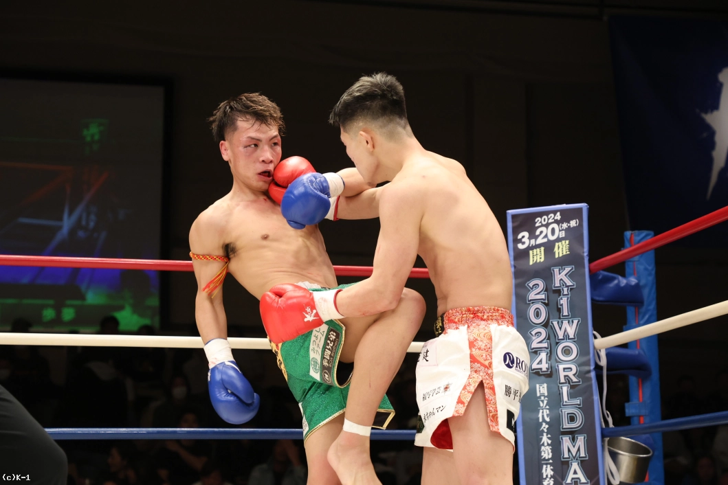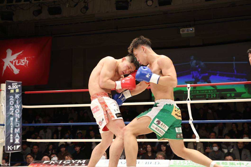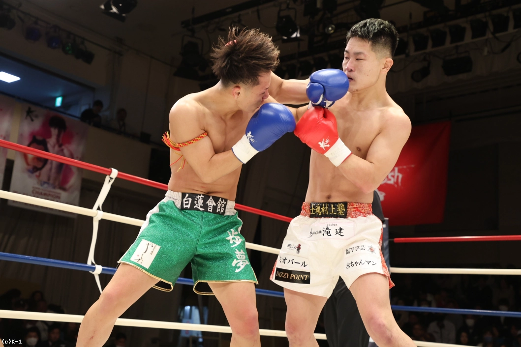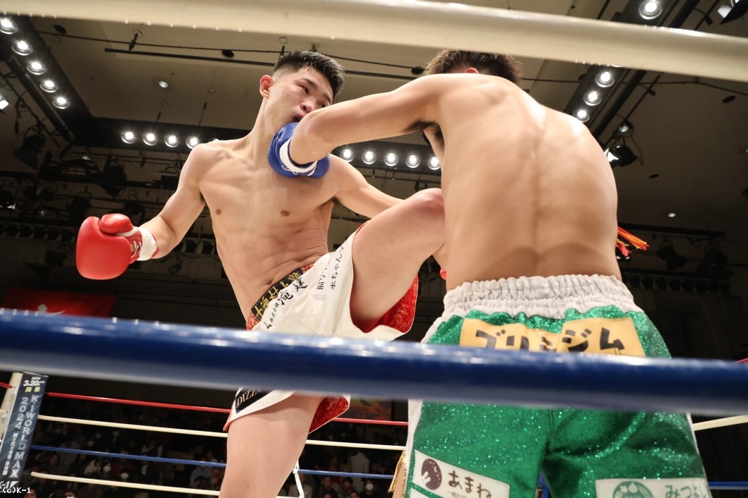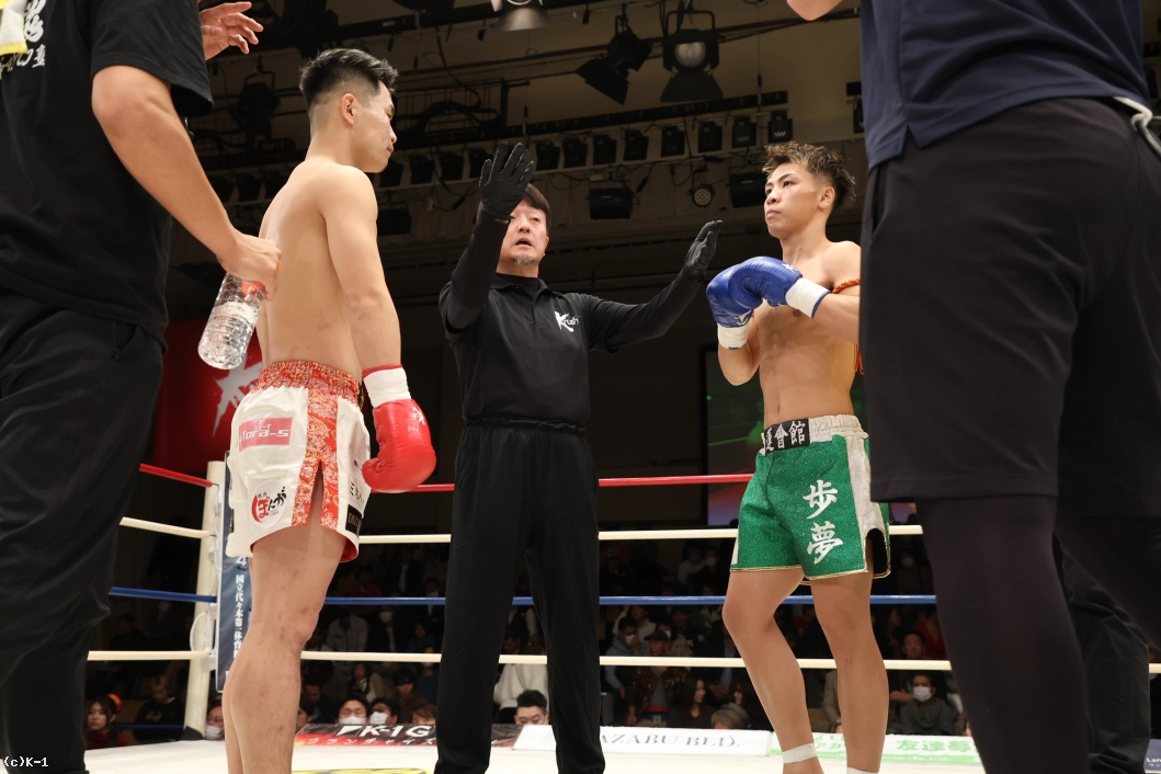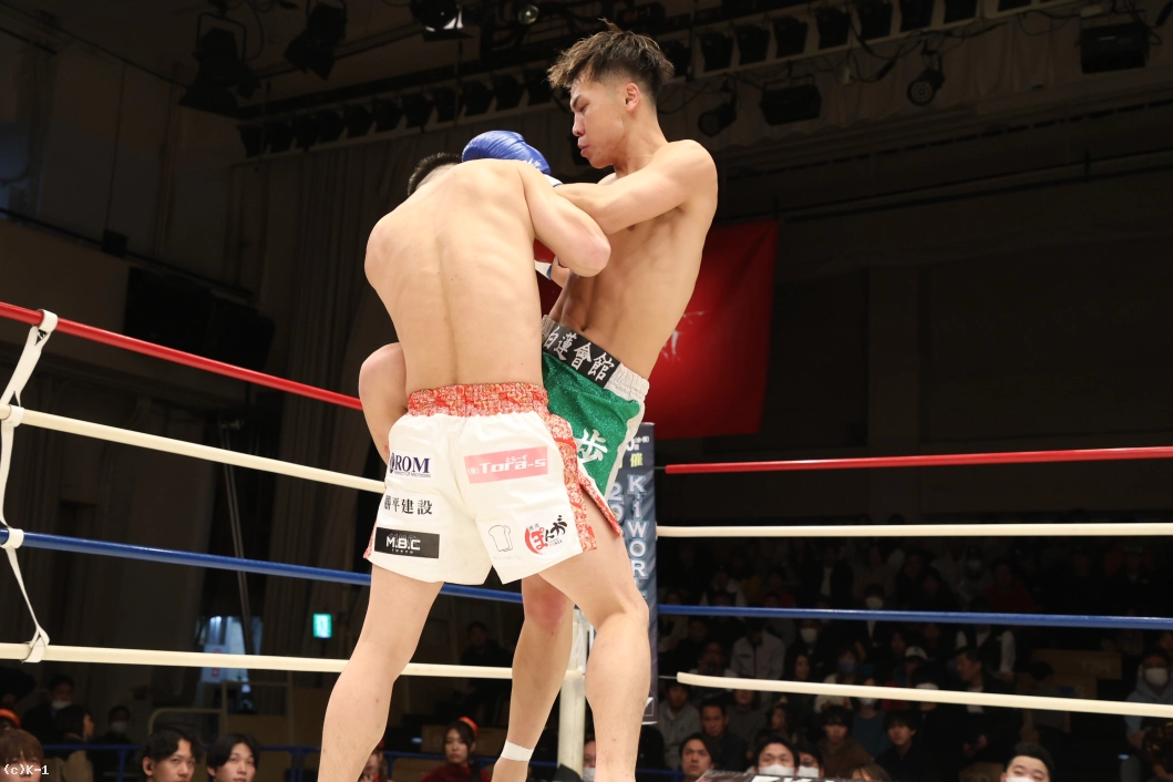 3R、歩夢の左フックが当たるが、昇也は下がらない。警告を与えられた後にもパンチを当てる歩夢だが、昇也は前に出てパンチで打ち返していく。フック、ヒザ蹴りで攻める歩夢。それに対して昇也ボディブロー。ならばと歩夢もパンチを振るって攻め手を緩めない。右のフック、ヒザを出したが、昇也の右フックでダウンを喫してしまう。だが、歩夢が立ち上がったところで試合終了。判定は28-27、28-27、28-27で3-0となり、昇也が判定勝利となった。
