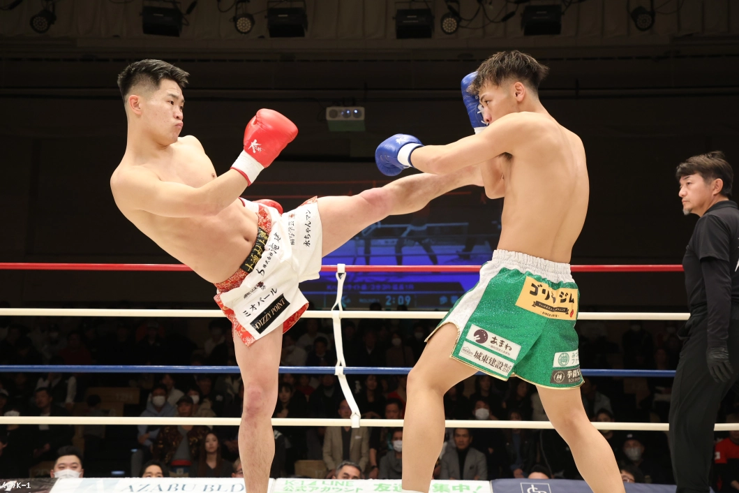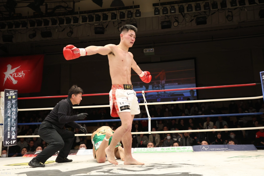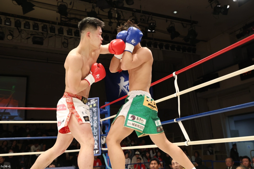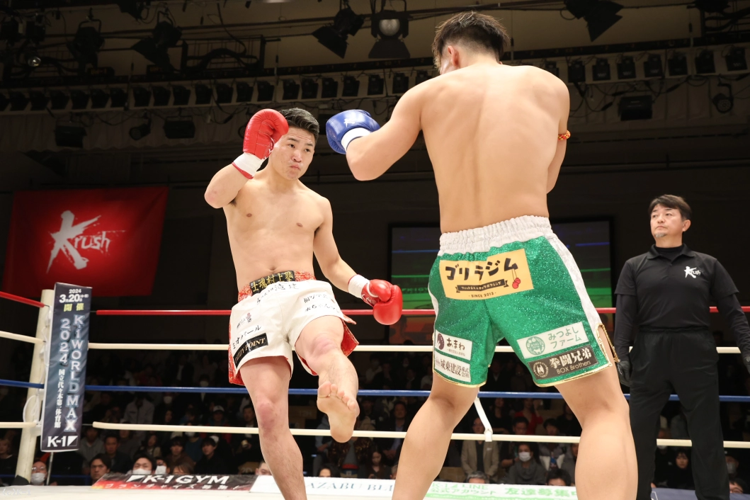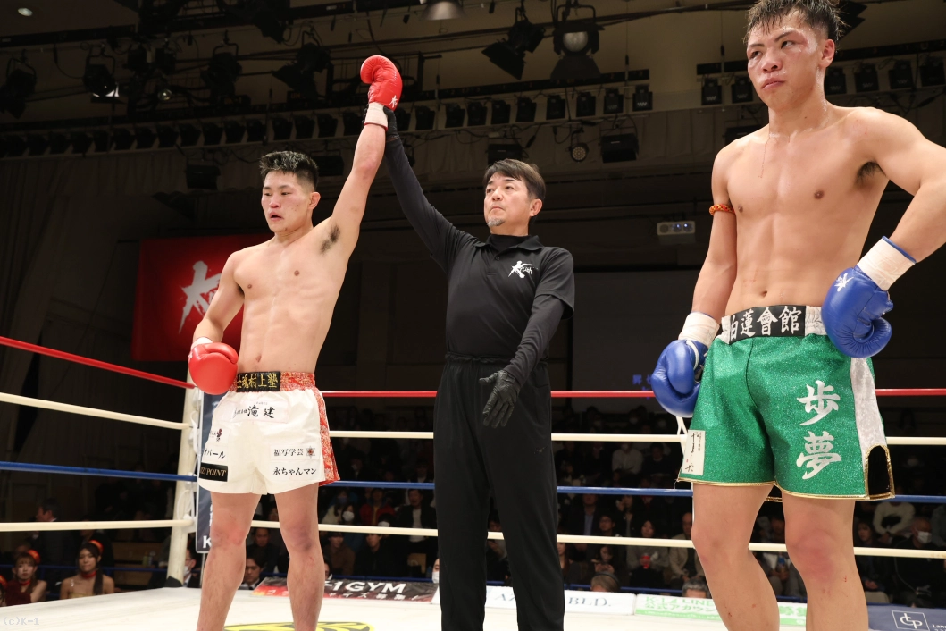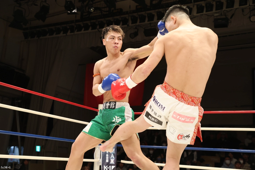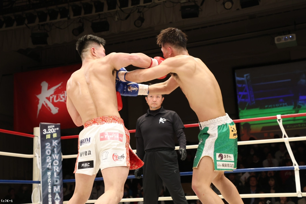 3R、歩夢の左フックが当たるが、昇也は下がらない。警告を与えられた後にもパンチを当てる歩夢だが、昇也は前に出てパンチで打ち返していく。フック、ヒザ蹴りで攻める歩夢。それに対して昇也ボディブロー。ならばと歩夢もパンチを振るって攻め手を緩めない。右のフック、ヒザを出したが、昇也の右フックでダウンを喫してしまう。だが、歩夢が立ち上がったところで試合終了。判定は28-27、28-27、28-27で3-0となり、昇也が判定勝利となった。