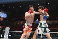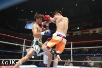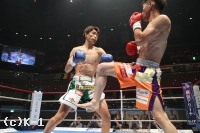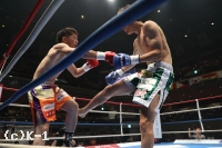 2Rも上野はミドル、ハイキックと蹴っていくが、井上は距離を詰め左ストレート。上野はしかし右ローを井上に効かせる。上野はここを逃さず、カカト蹴りを交えてローを追加し井上からダウンを奪う。