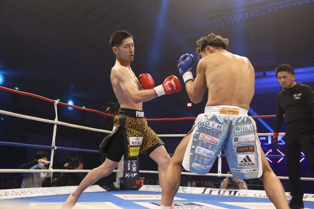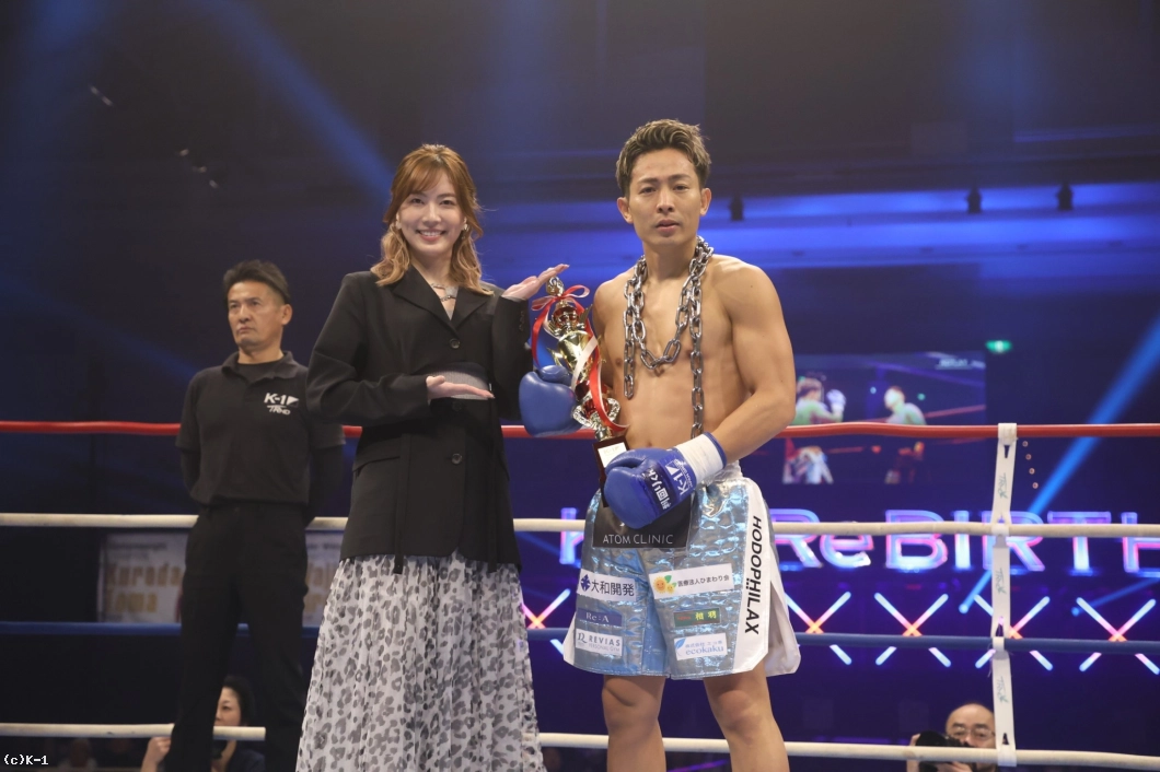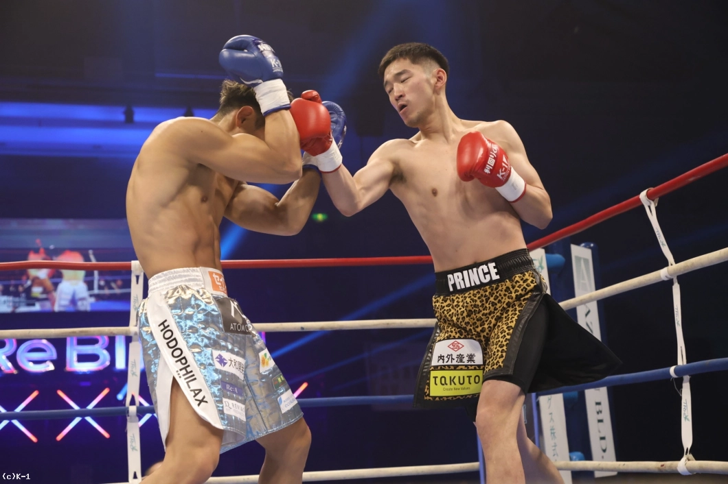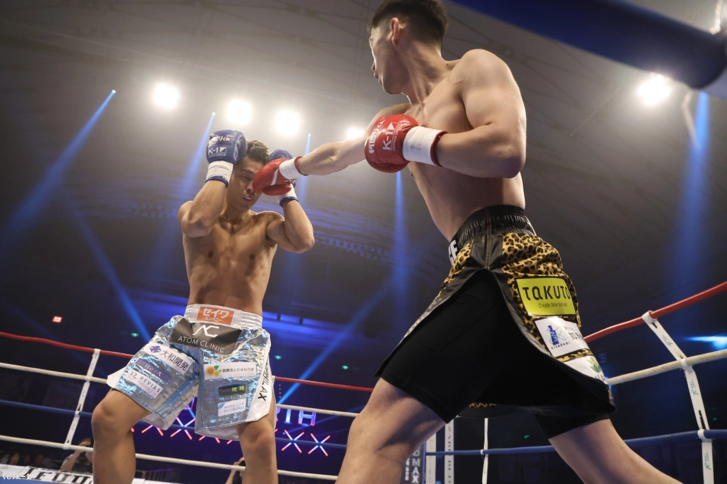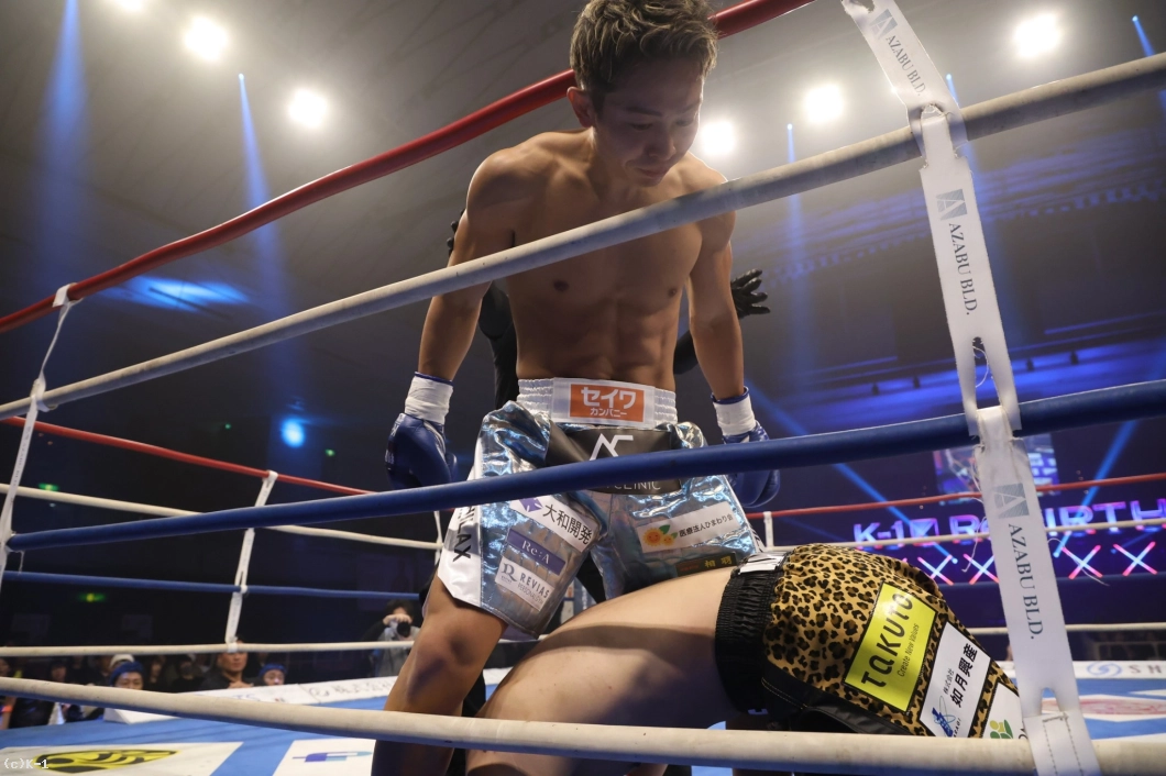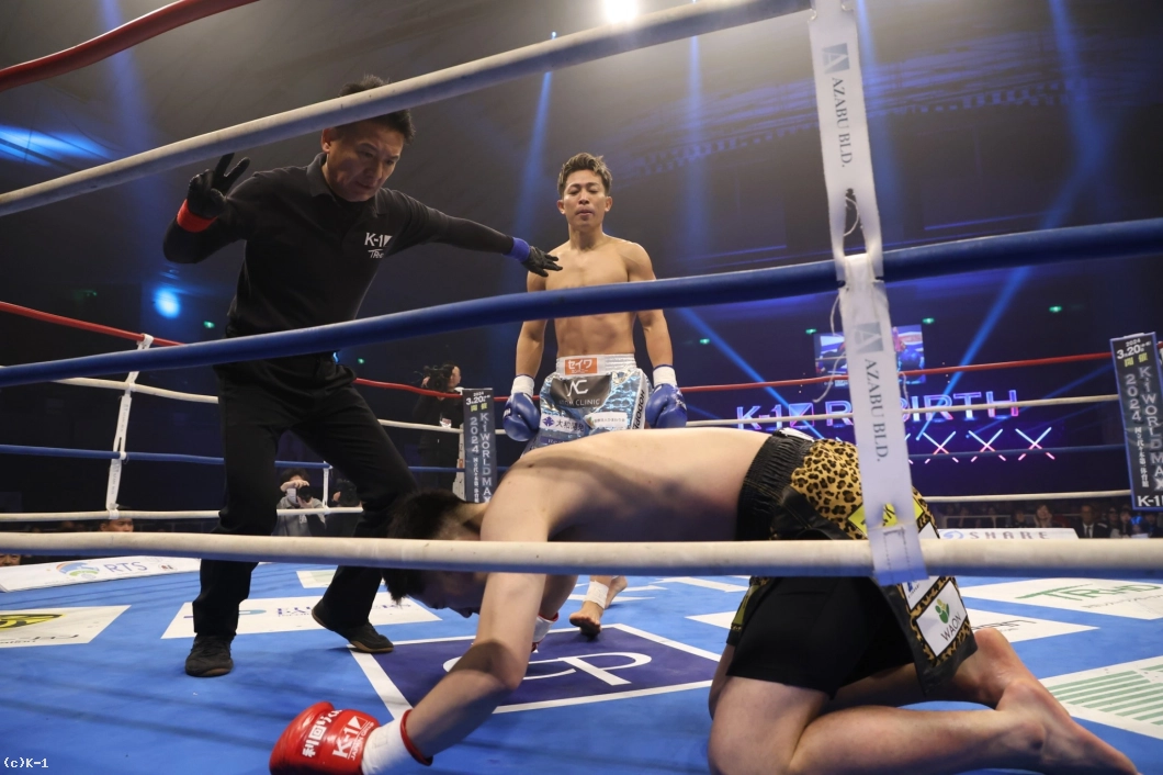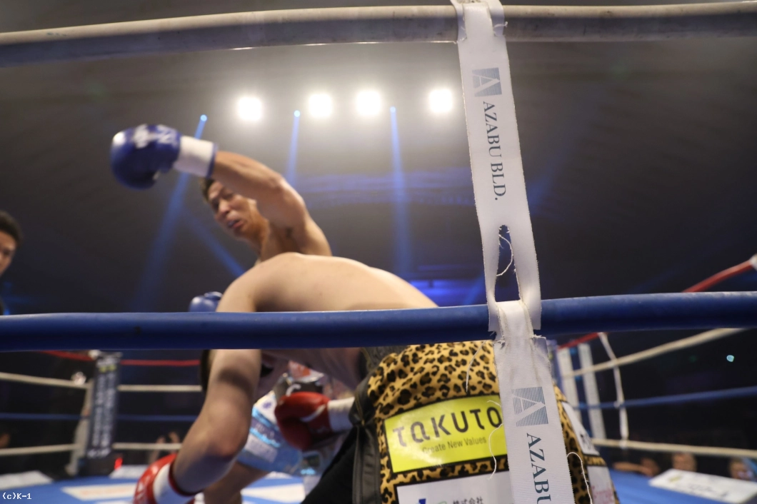 1R、大岩は右のカーフキックを蹴っていく。篠原は回りながら、右、左のパンチを打っていく。篠原は左をつくも、大岩は右フックを合わせに行く。篠原は左、右を放って行くと大岩は右フック。そして、大岩が打ち合いの中で左をヒットして、そして右でダウンを奪う。立ち上がった篠原だが、レフェリーが試合をストップした。