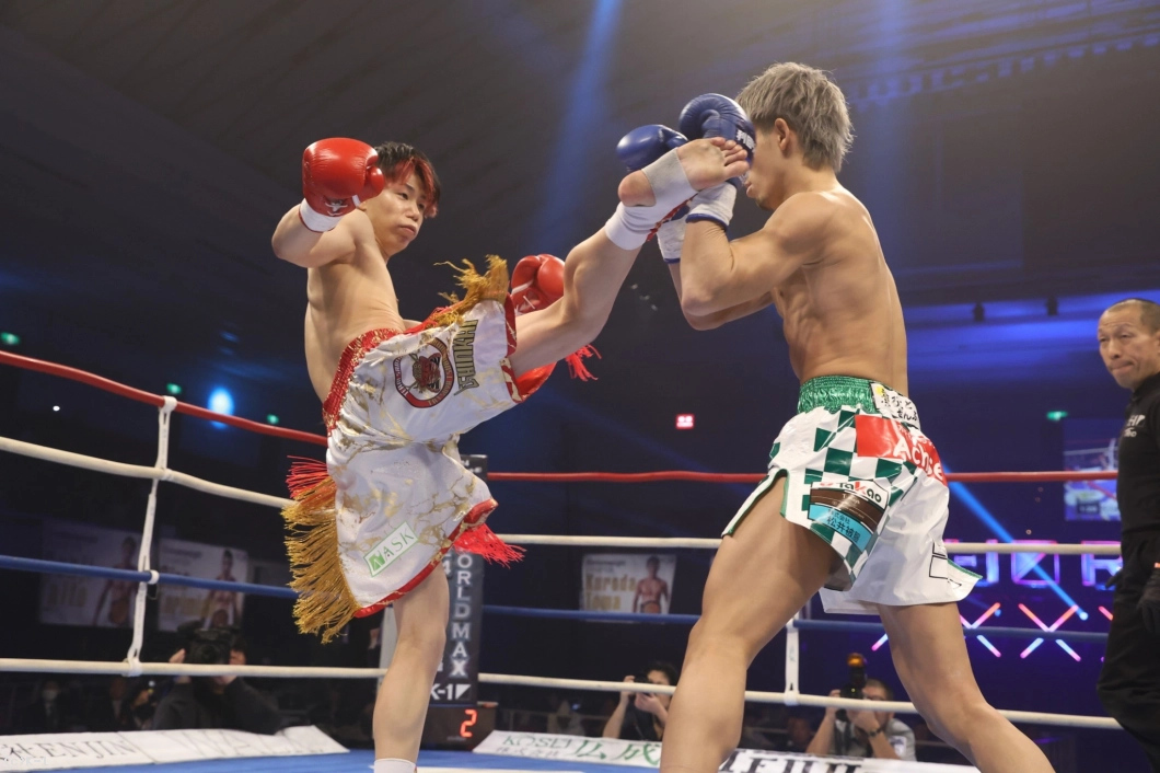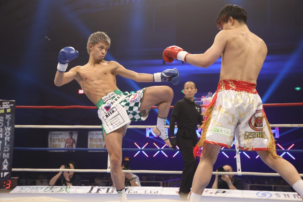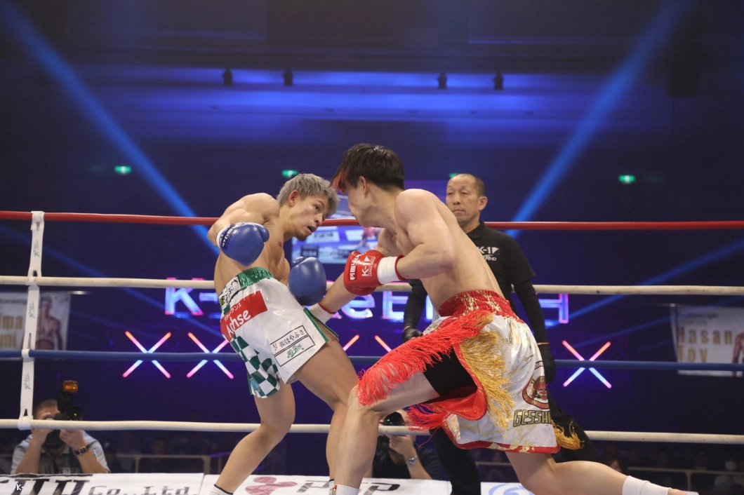 1R、椿原はカーフキック、前蹴りで攻撃。サウスポー構えの健介は、前後にステップしながらプレッシャーをかける。椿原はカーフキックを蹴りつつ、様子を見る。健介はロ―キック、さらに三日月蹴り。椿原は素早く蹴り返し。椿原は前足を殺しながら、パンチでカウンターを狙っていった。