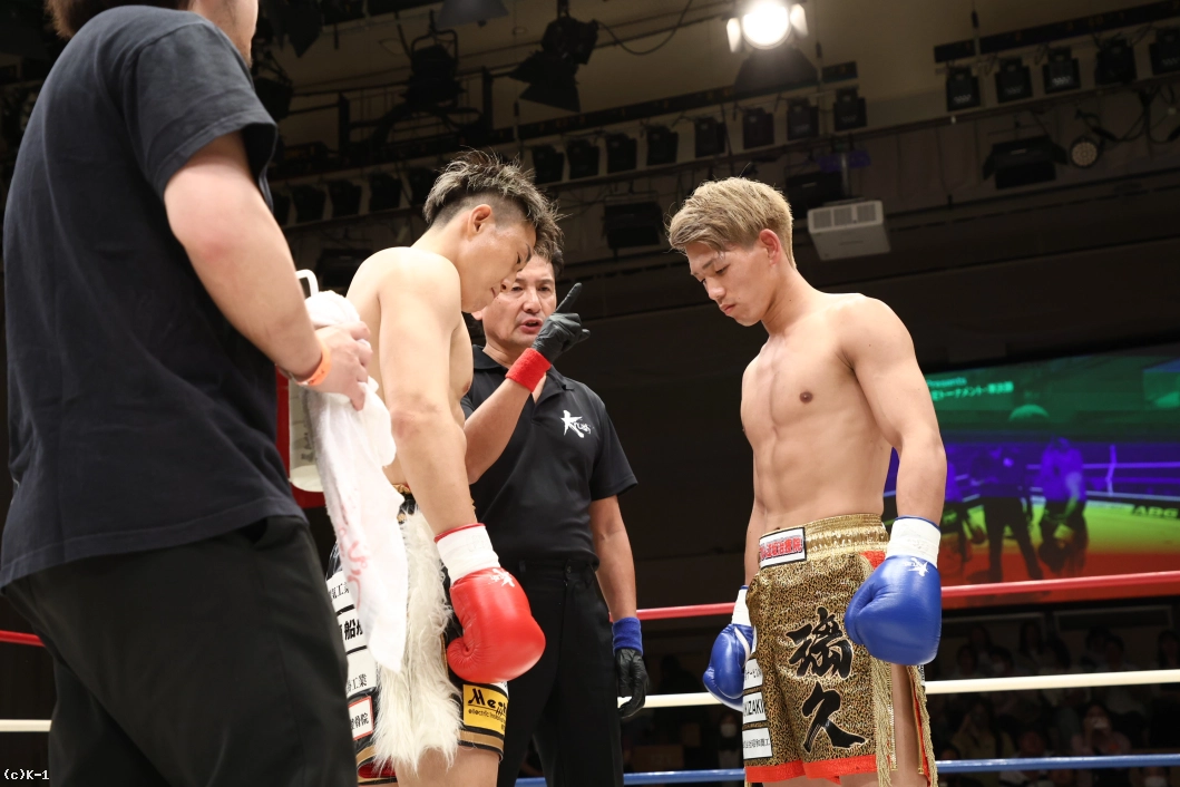 3R、リングを回る璃久を追う藤村。璃久の打ち終わりを狙った藤村の右フックを浴び、璃久がバランスを崩す。手数を増やす璃久に重いパンチで応戦する藤村。終了直前にパンチの打ち合いを見せる両者。最後に打ち抜いた璃久の右ストレートを浴びて藤村が後ろに倒れるが、ゴング後の攻撃によるノーダウンと判断されて試合終了を向かえた。