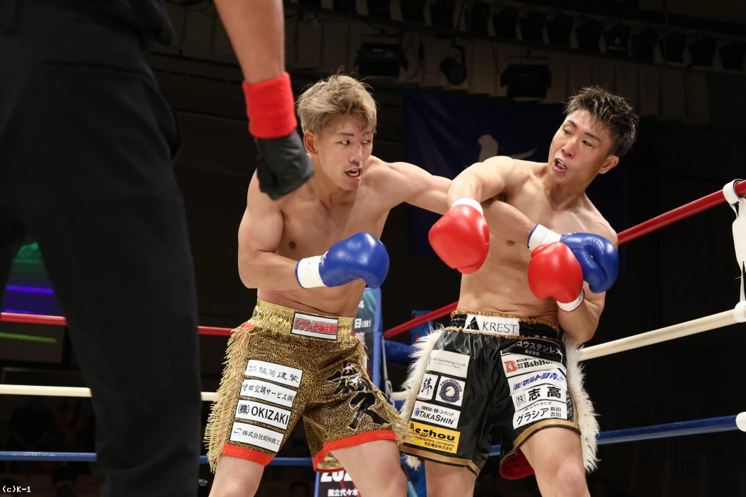 2R、璃久は上下にリズムを取りながら右カーフで削る。璃久はスイッチしながらリズムよくワンツー、カーフ。手数は璃久が上回り、徐々に藤村はカーフが効いたか足が鈍る。璃久の入り際に藤村が右ストレートを直撃させ、璃久はロープまで後退。藤村は一気に距離を詰めるが、璃久は手を止めずにしのぎきる。