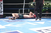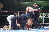 1R、カリミアンは右カーフキック連発。イストラテは左フックで襲い掛かる。カリミアンは右のカーフキックで削っていく。イストラテは左フックでダウンを奪う。立ち上がるカリミアン。イストラテのパンチが後頭部に。倒れ込むカリミアン。会場から「あー」という声。また反則だ。立てないカリミアン。ドクターがカリミアンに近寄ると、意識が遠のいている印象。ここでゴングが鳴り、担架が運び込まれた。