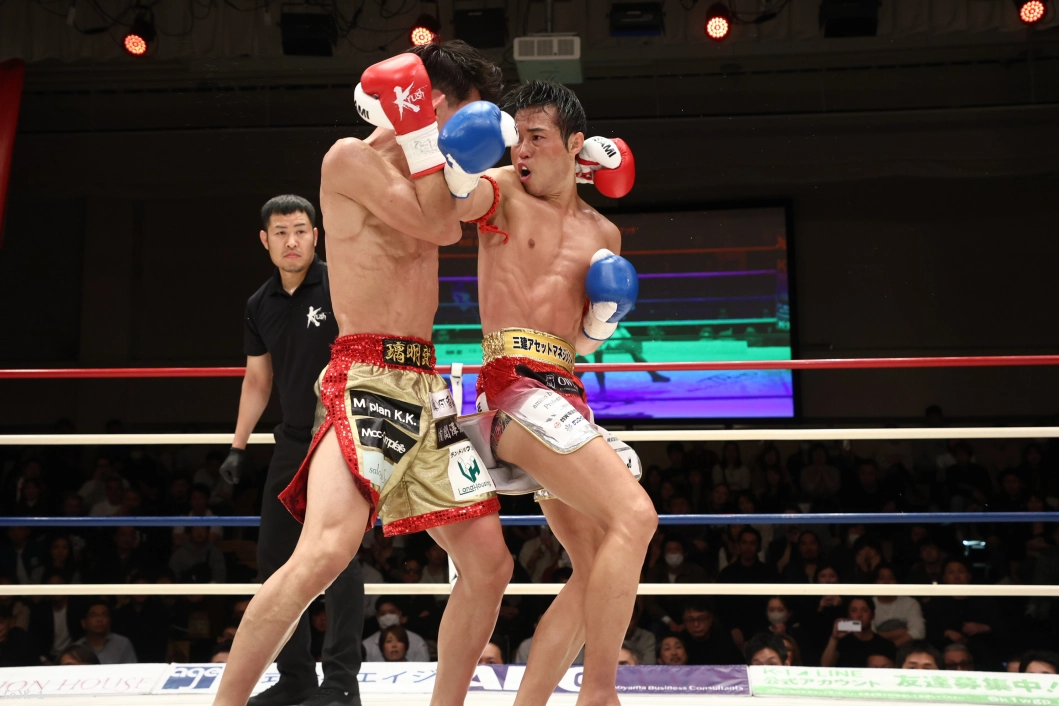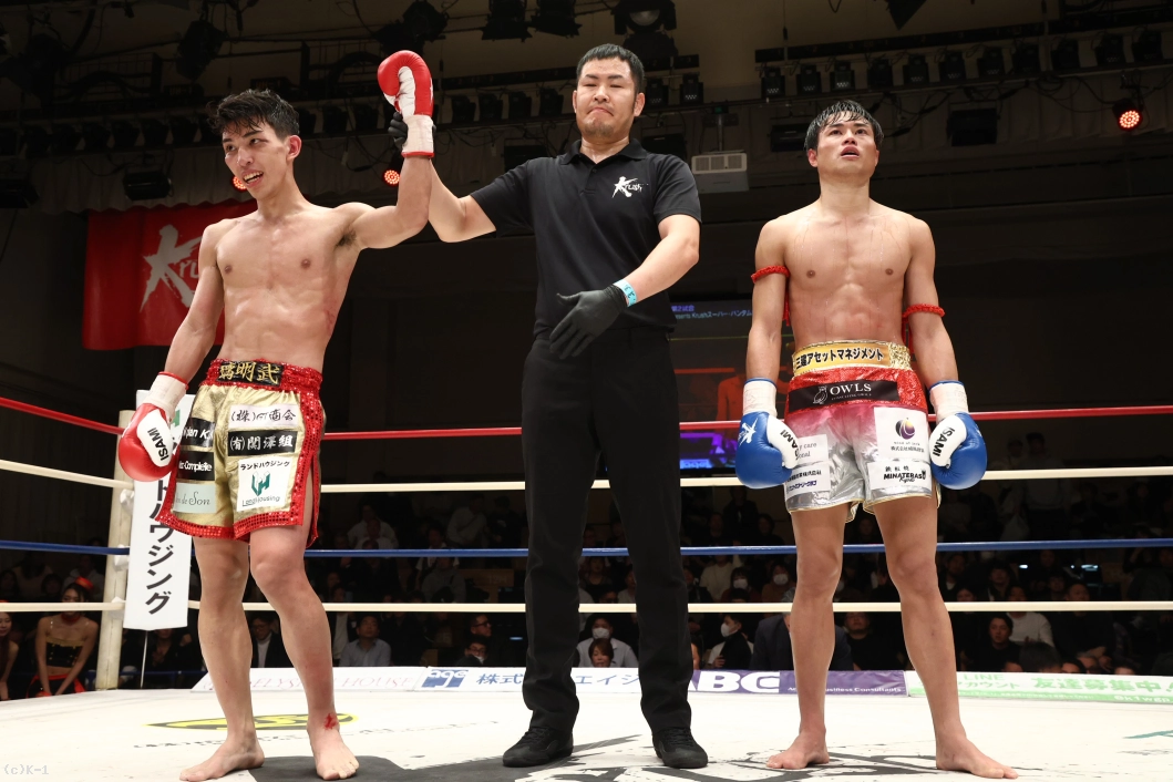 延長R、池田がゴングと同時に右のミドルキック。璃明武もボディブローを連打しながら前に出る。璃明武は池田がバックブローを放ったところでパンチをまとめる。さらにパンチを放ちながら前に出てプレッシャーをかけていく。しかし、池田も下がらない。近い距離からヒザ蹴りを連発だ。ならばと璃明武がパンチを連打。池田もパンチで応戦。両者、近い距離でパンチの打ち合いとなる。最後に璃明武が顔面にパンチの連打をしたところで、ゴング。再び判定となり、10-9、10-9、10-9の3-0で璃明武が勝利を飾り、Krushスーパー・バンタム級王座の3度目の防衛に成功したのだった。