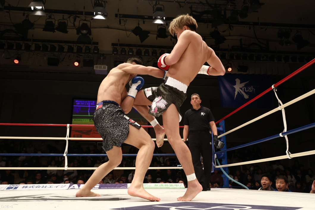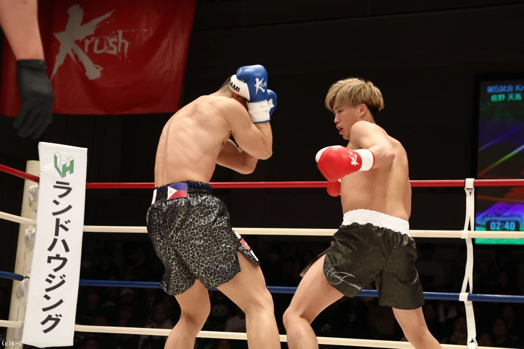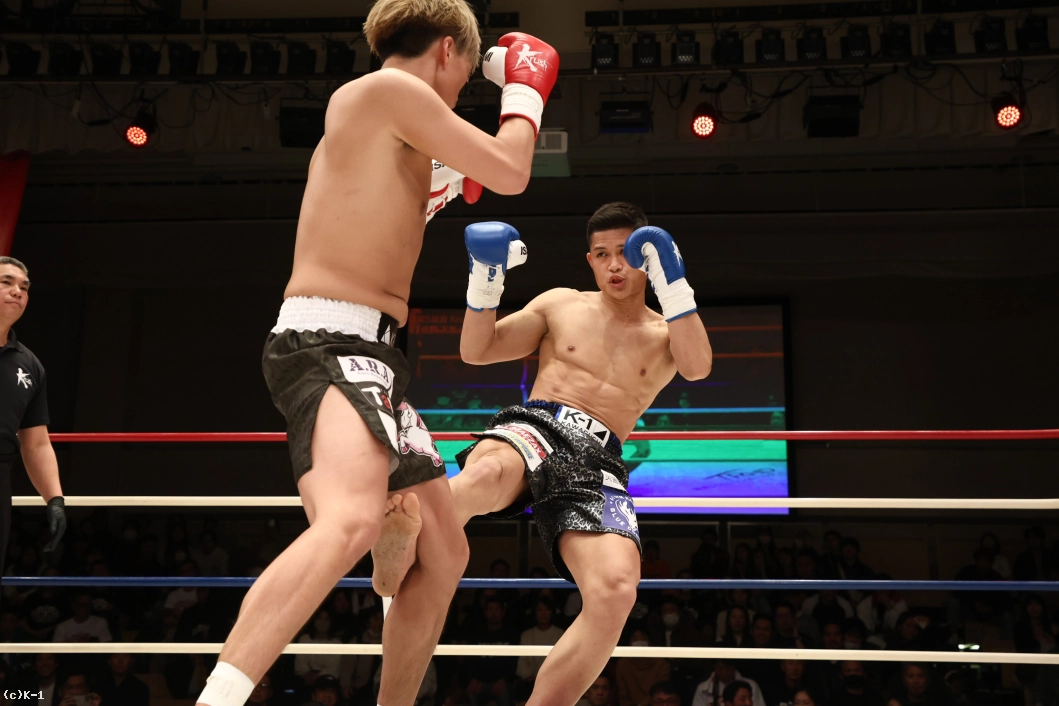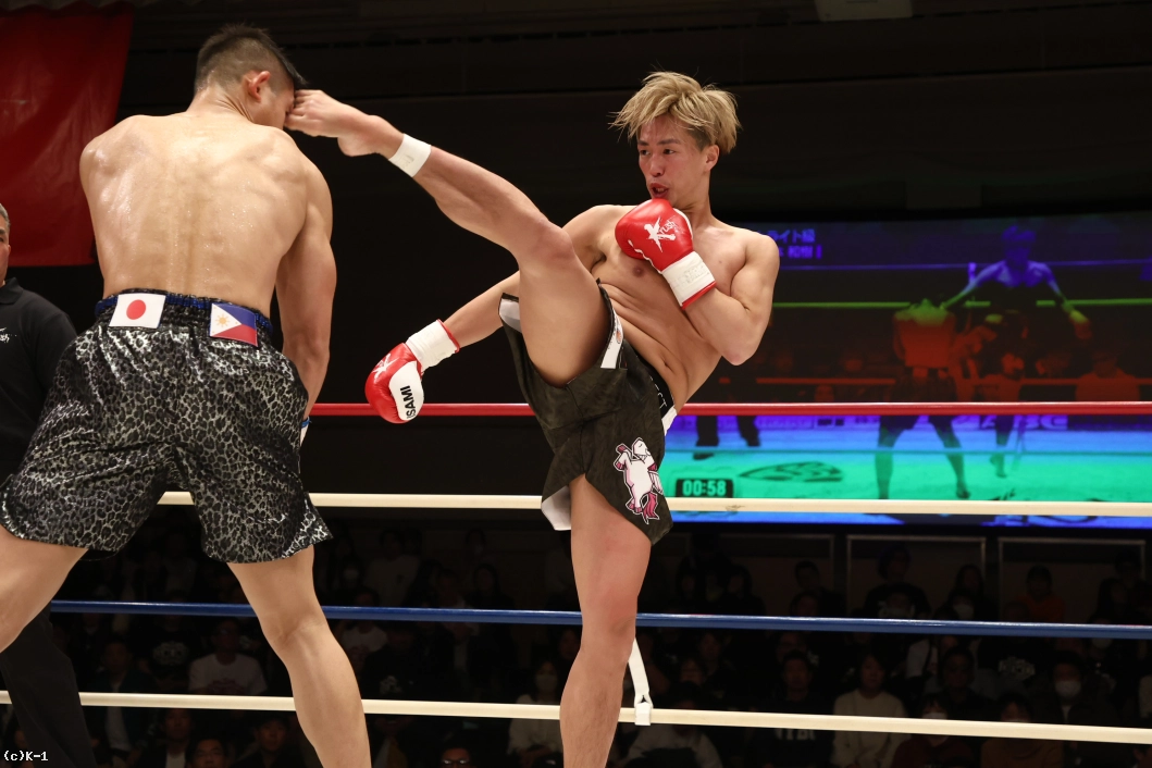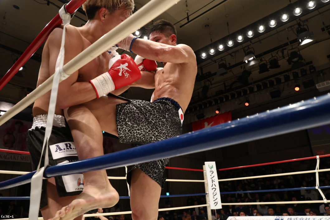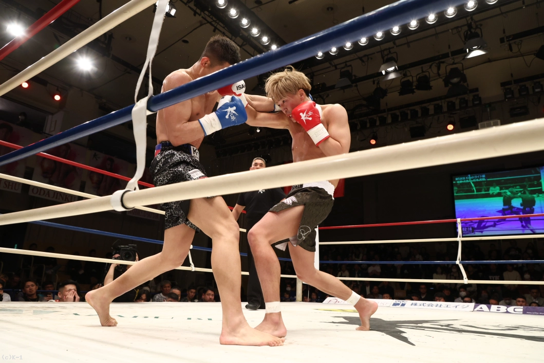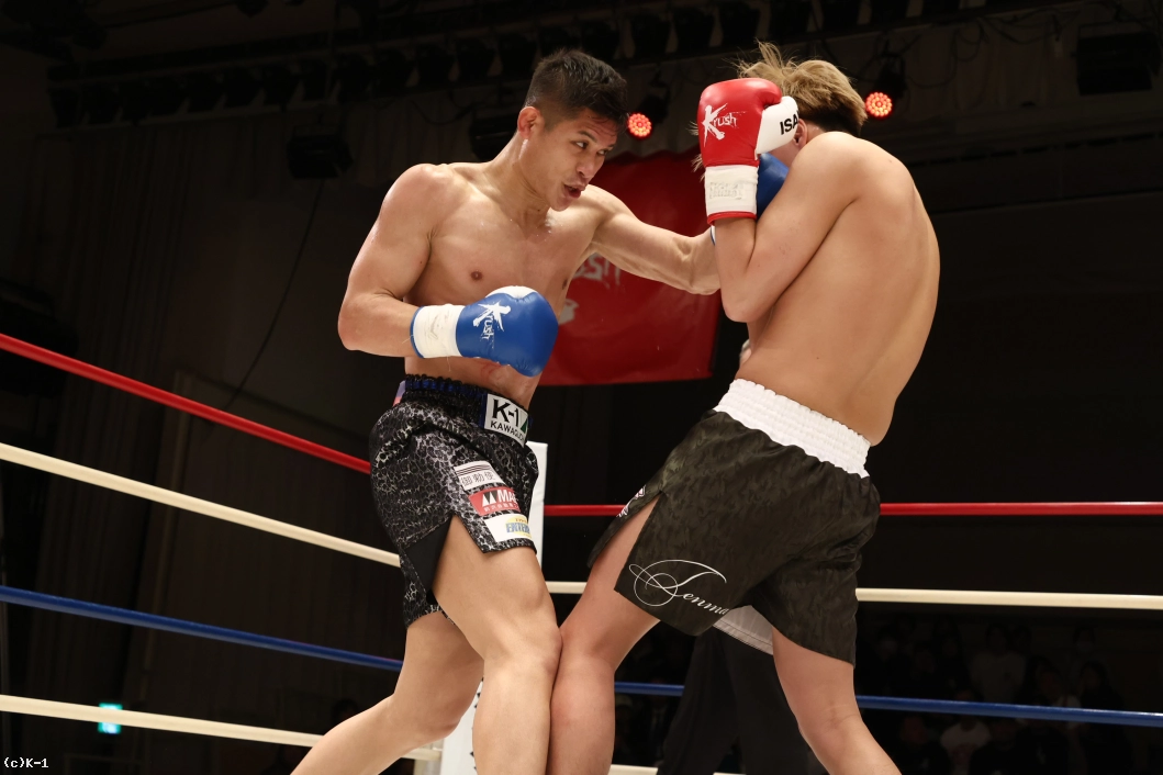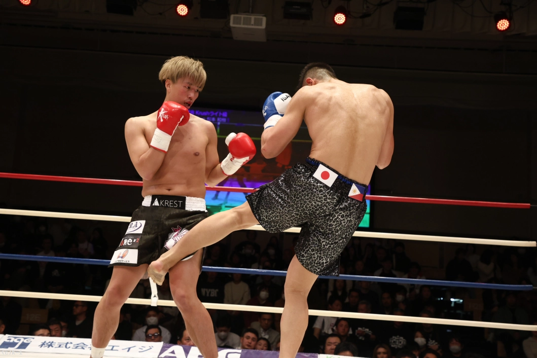 1R、松本がプレッシャーをかけてカーフキックを打ちながら前に出る。松本はさらにローキック、パンチを打ちながらロープに追い込んでいく。佐野も回り込みながら、決定打を許さない。体勢を入れ替えた佐野はジャブを当てていく。さらに三日月蹴りを入れると松本の動きが鈍くなる。そこで佐野はボディブロー、三日月蹴りを打ち込んでボディにダメージを与えていく。