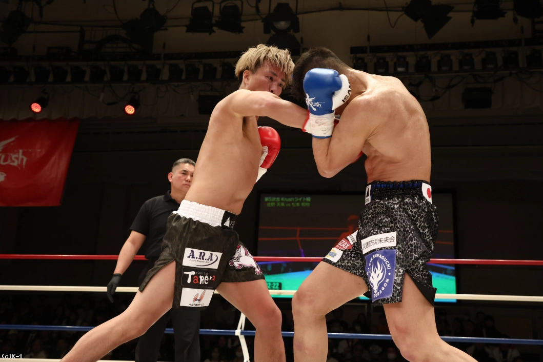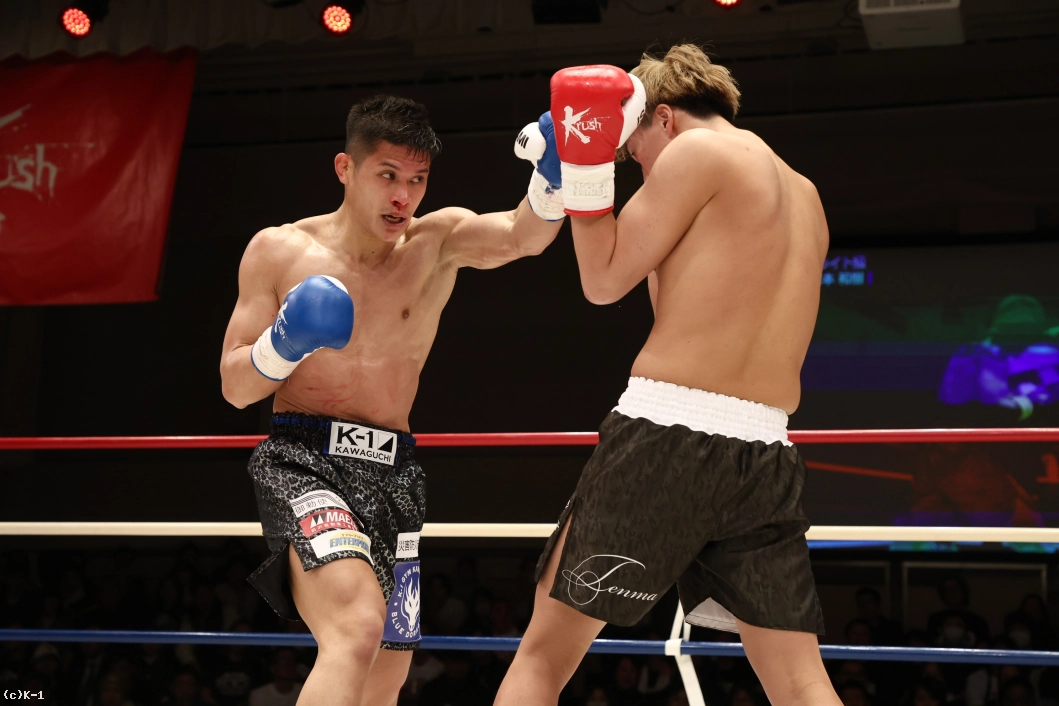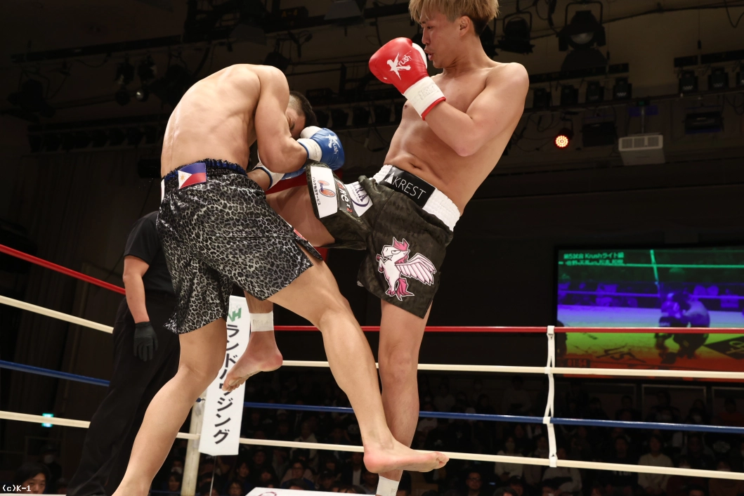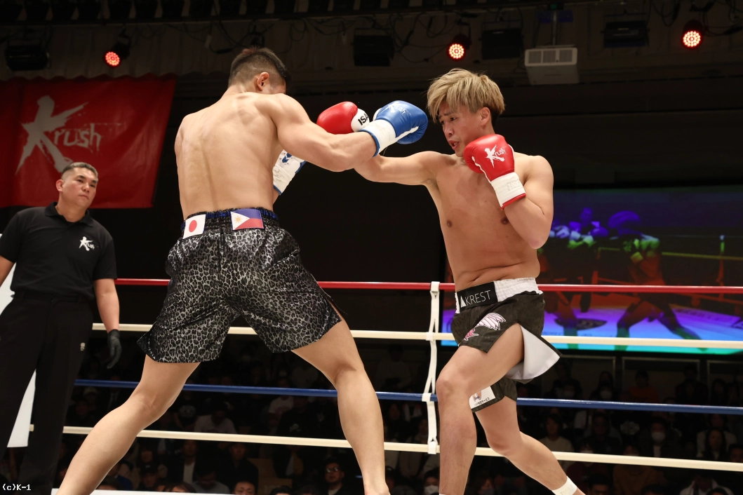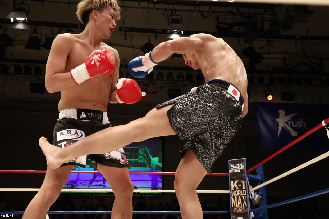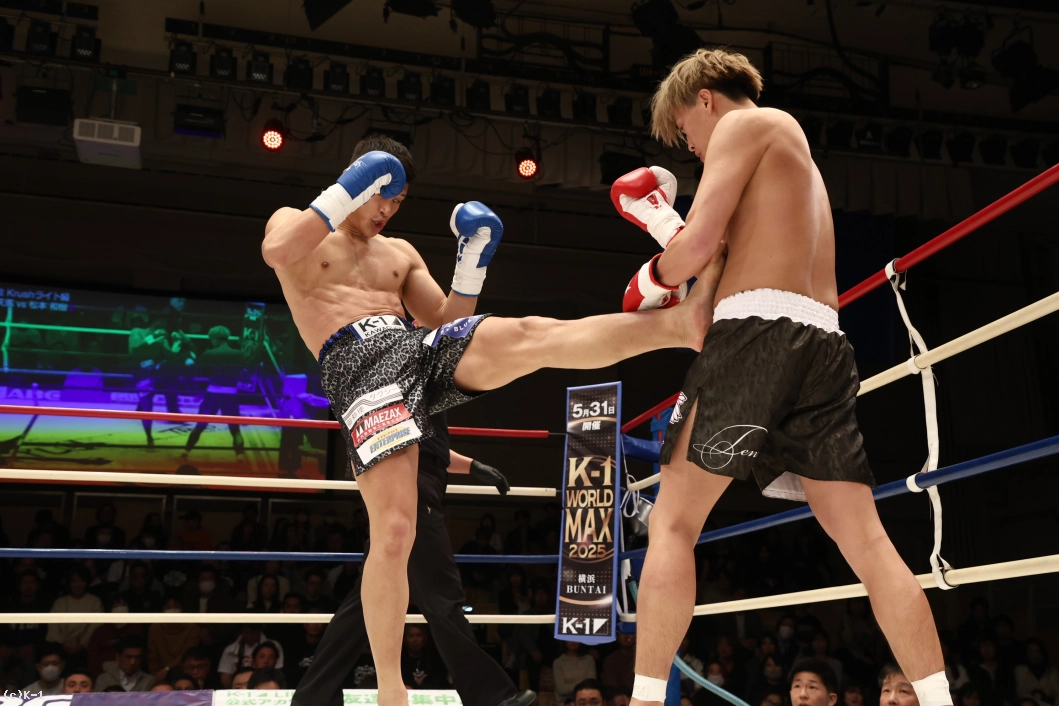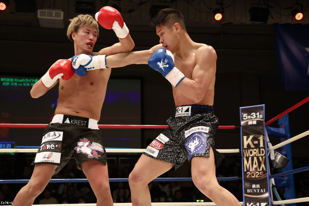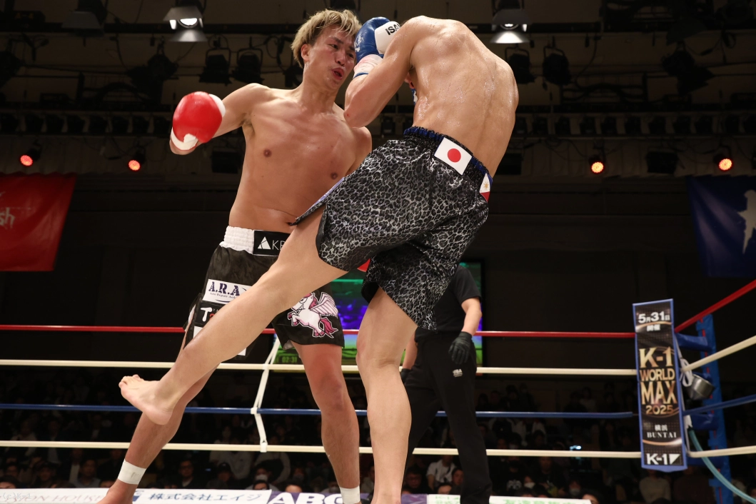 1R、松本がプレッシャーをかけてカーフキックを打ちながら前に出る。松本はさらにローキック、パンチを打ちながらロープに追い込んでいく。佐野も回り込みながら、決定打を許さない。体勢を入れ替えた佐野はジャブを当てていく。さらに三日月蹴りを入れると松本の動きが鈍くなる。そこで佐野はボディブロー、三日月蹴りを打ち込んでボディにダメージを与えていく。