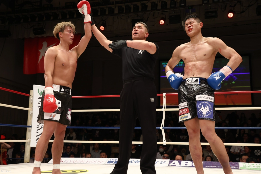 3R、松本は前に出て佐野をロープに追い込んでいくが、佐野は右のローキックで返していく。さらに左のボディブロー。顔面にパンチのコンビネーションを放ち、ヒザ蹴りも放つ。しかし、松本も耐えてパンチを打ちながら応戦。そこに佐野の右フック。それでも前に出る松本。逆転を狙って佐野とのパンチの打ち合いに挑むが、ゴングが鳴って試合終了。判定となり、30-29、30-29、30-29の3-0で佐野が約4年ぶりの勝利をもぎ取った。