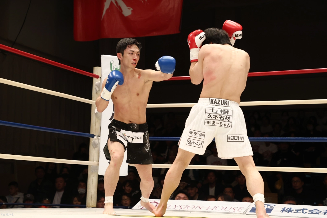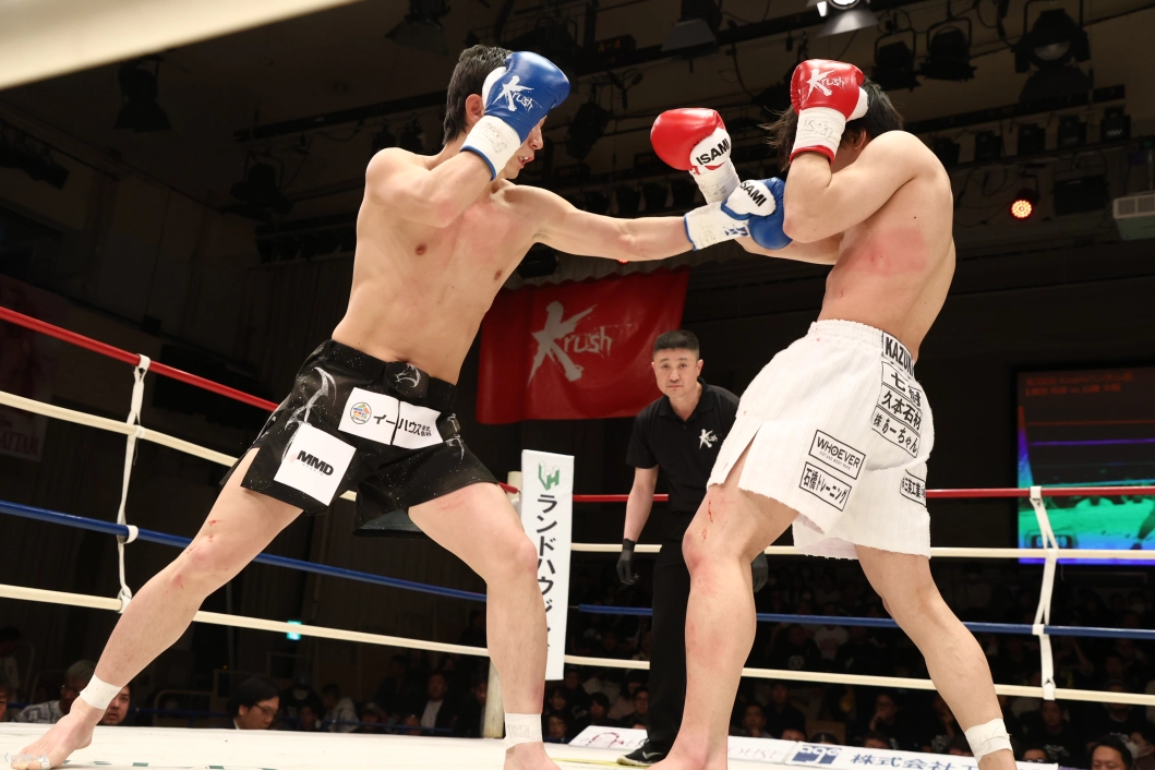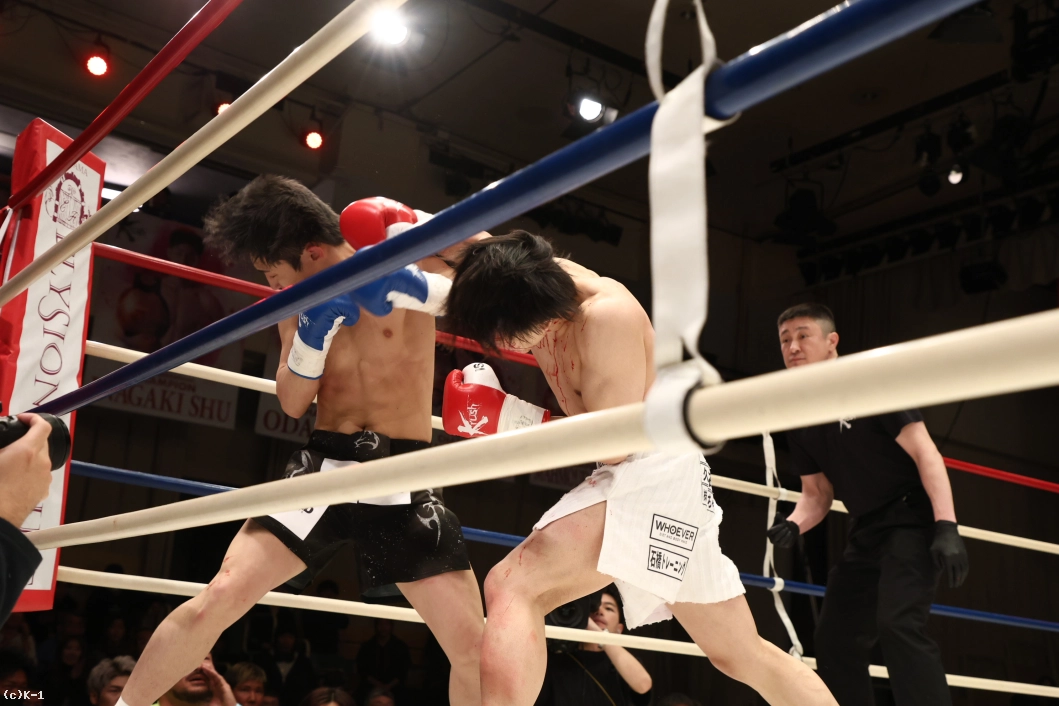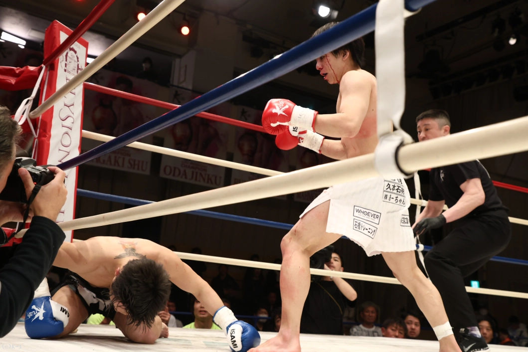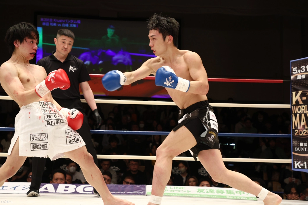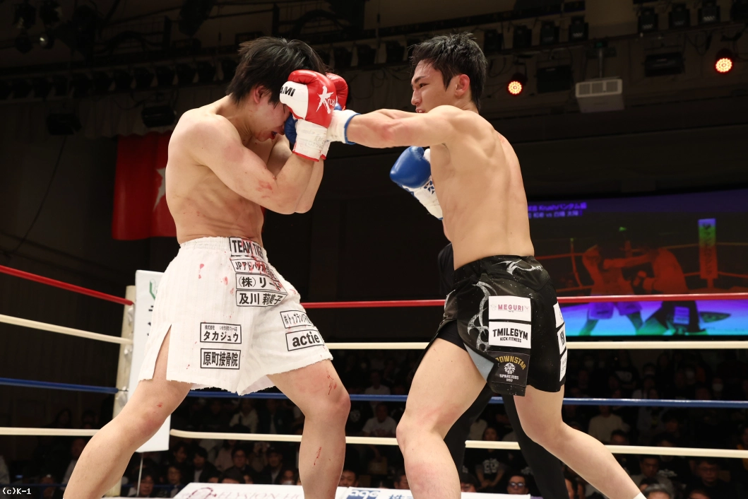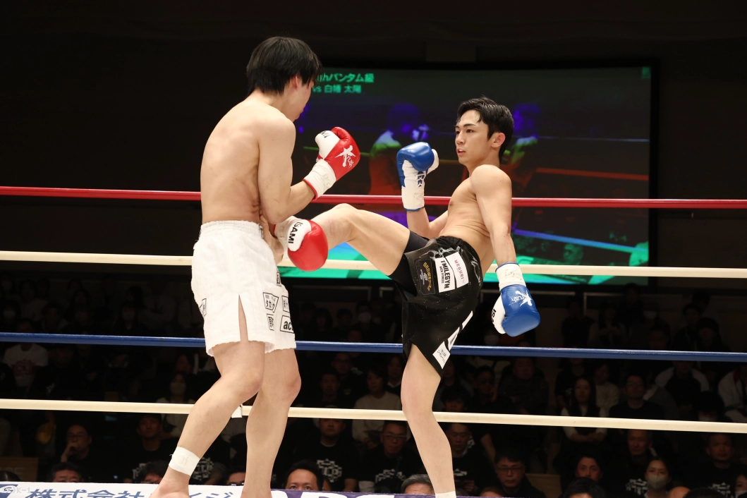 3R、藤田はパンチを繰り出しながらプレッシャーをかける。だが、白幡もパンチで応戦。藤田の顔面にヒットさせる。下がりながらもパンチをヒットさせ、飛びヒザを繰り出す白幡。だが、下がらない藤田は白幡をコーナーに追い込んでパンチを連打。顔面、ボディと連打し、ついに右フックで白幡がダウン。3R1分44秒で藤田がKO勝利となった。
