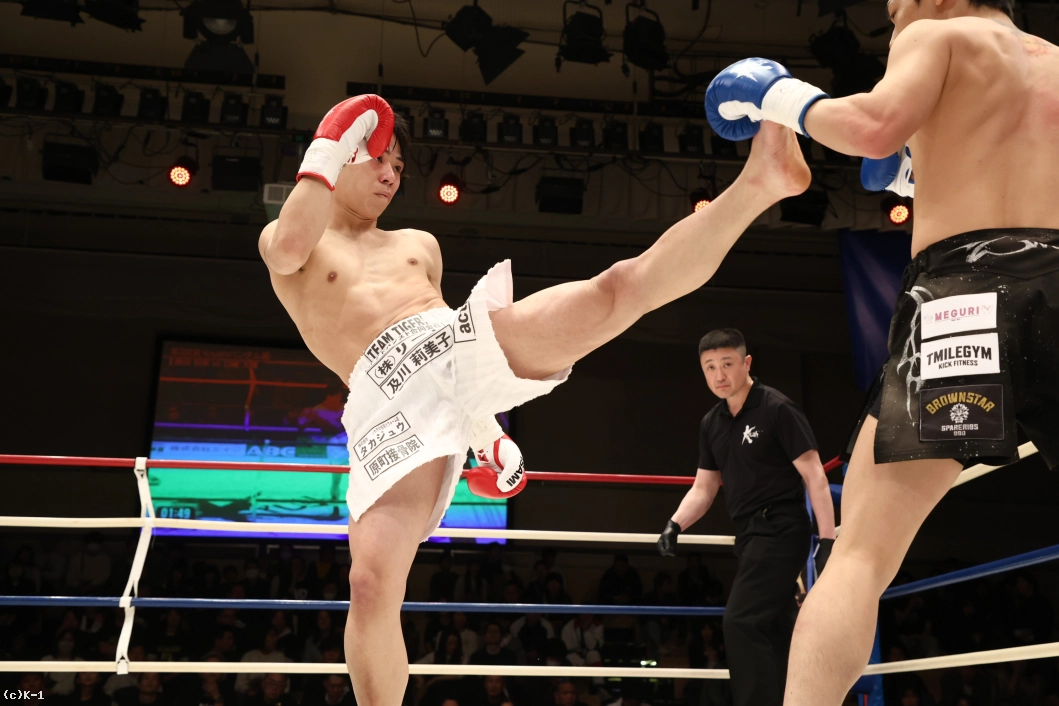 1R、お互いにジャブとローキックを放ちながら様子を見合う。ジリジリと藤田がプレッシャーをかけて、ロープに追い込んでパンチを連打。だが、白幡もすぐに回り込んでいく。再び藤田はロープに追い詰めてパンチを連打。これを脱した白幡は飛びヒザ蹴りだ。白幡は回り込みながらパンチとローキック。白幡は右のミドルキック。それに対して藤田がパンチの連打。さらにコーナーに追い詰めて連打していく。しかし、白幡もガードして回り込んで脱出。ここでラウンド終了だ。