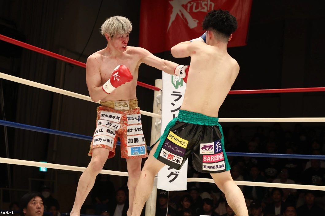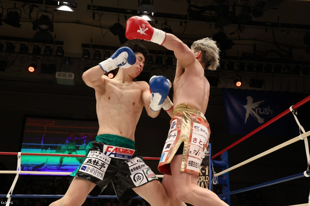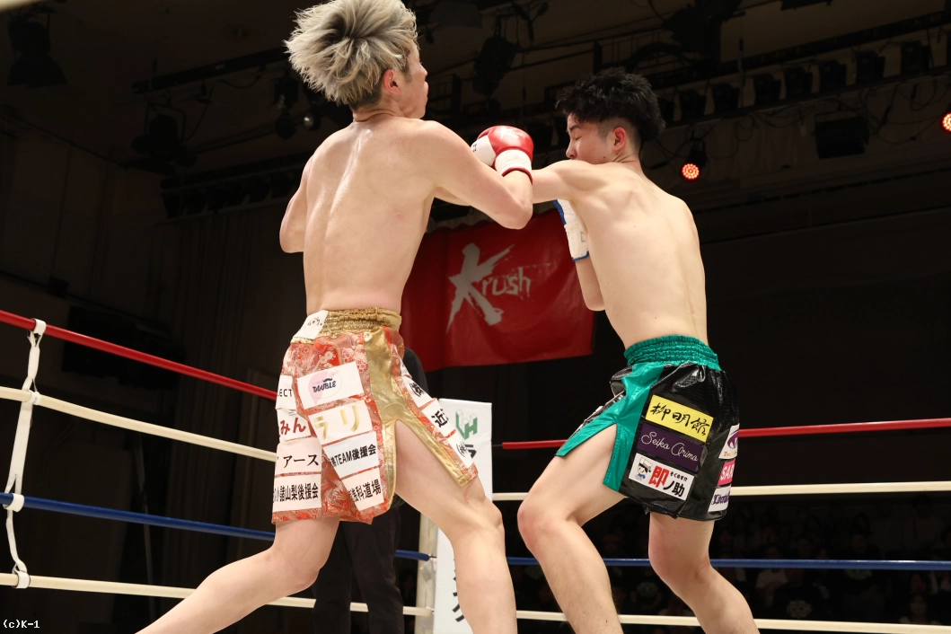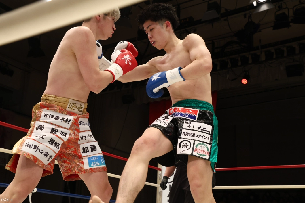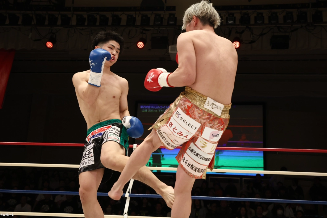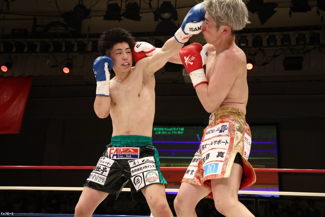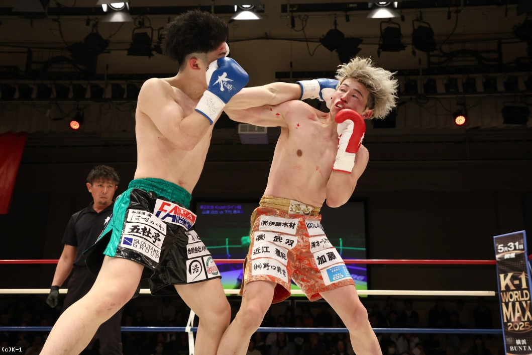 1R、まずは山浦がローキックを打っていくが、下村も中に入るようにパンチを打っていく。距離が近くなったところで、お互いにパンチを繰り出し合う。ここで下村が山浦をロープに追い詰めてパンチを連打。しかし、山浦もパンチで応戦。ローキックを放ちながら距離を取っていく。さらに山浦は回し蹴り。ならばと下村は前に出てコツコツとパンチを当てていく。山浦は鼻血が見られる。