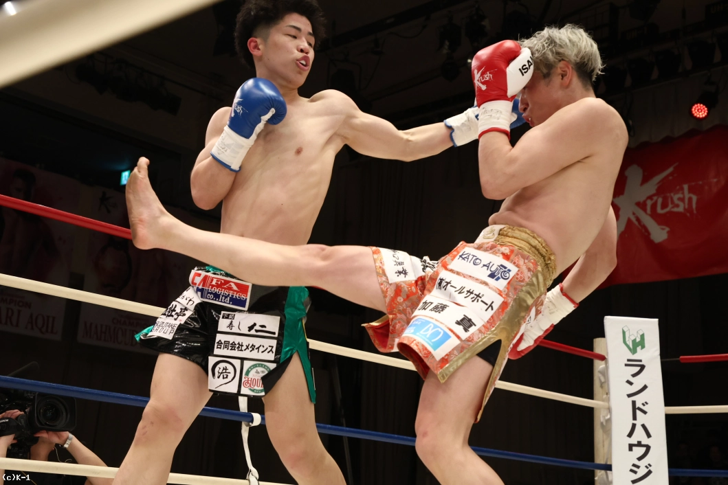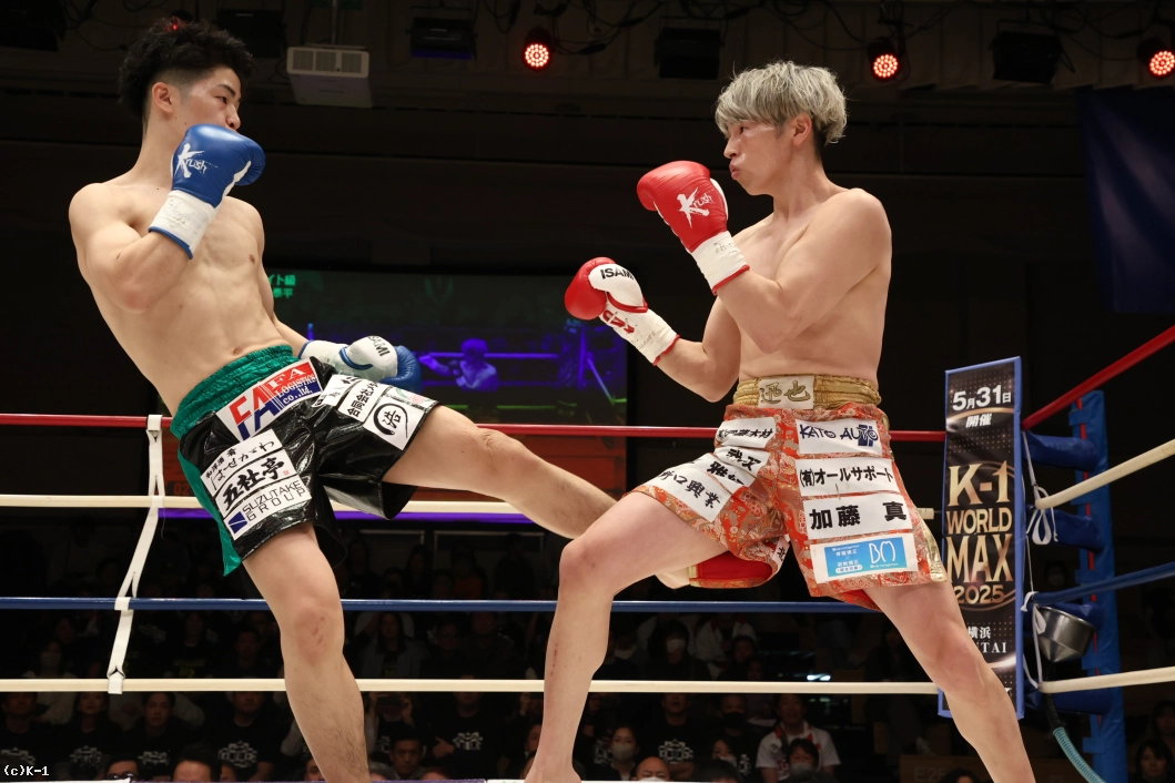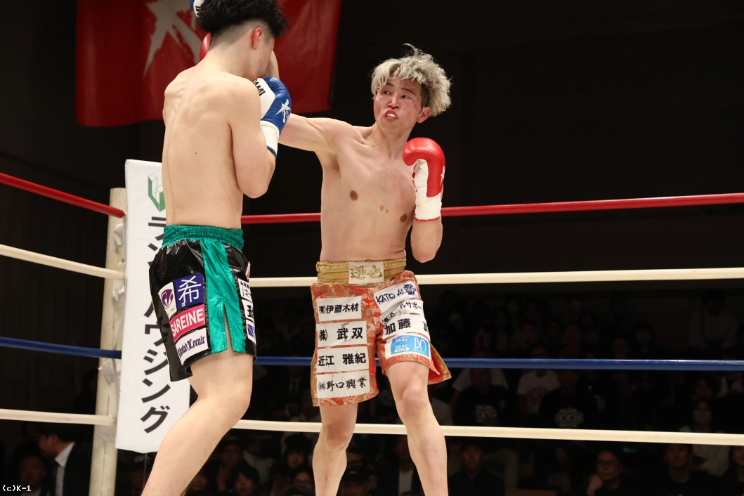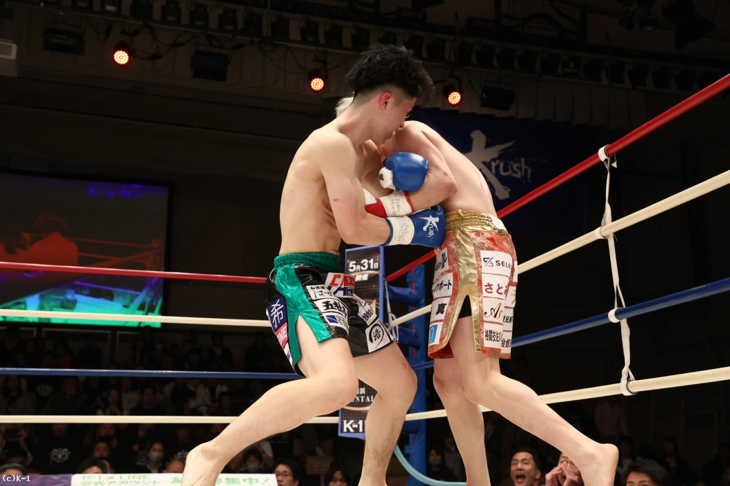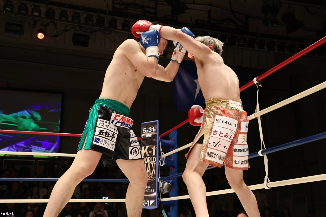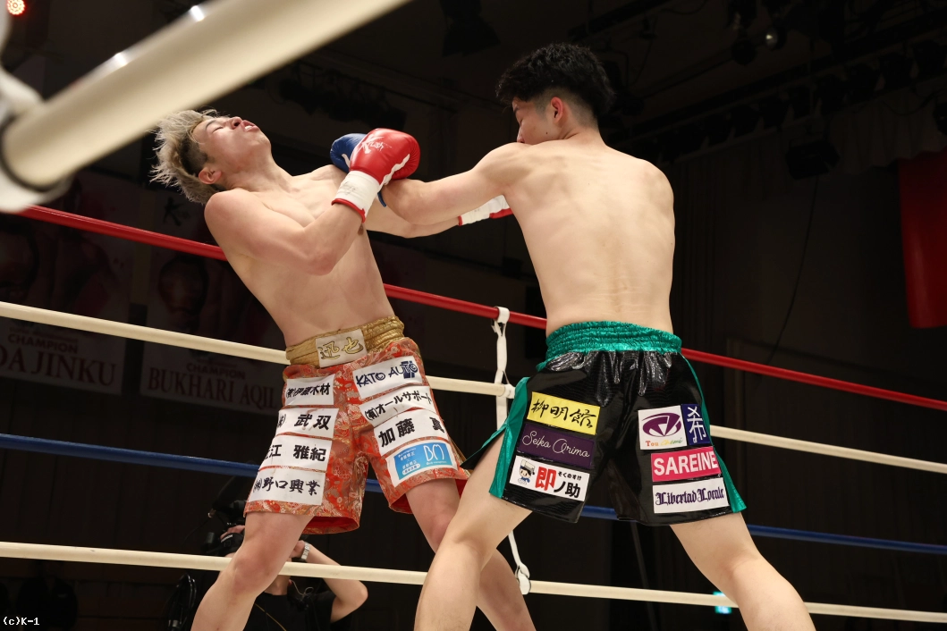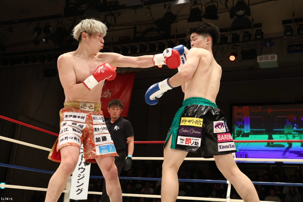 1R、まずは山浦がローキックを打っていくが、下村も中に入るようにパンチを打っていく。距離が近くなったところで、お互いにパンチを繰り出し合う。ここで下村が山浦をロープに追い詰めてパンチを連打。しかし、山浦もパンチで応戦。ローキックを放ちながら距離を取っていく。さらに山浦は回し蹴り。ならばと下村は前に出てコツコツとパンチを当てていく。山浦は鼻血が見られる。