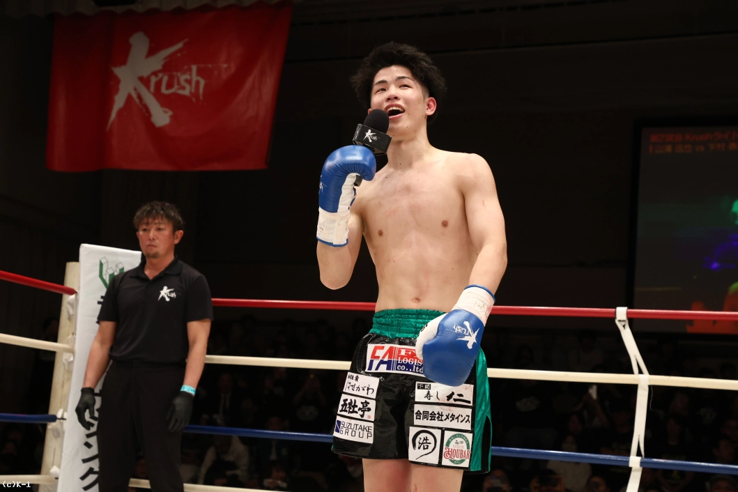 「こんにちは、下村泰平です。どうでした、俺の試合? 第1試合目として最高でしょう。いやあ、本当、こんな僕のために応援来てくれてありがとうございます。サポートしてくれた皆さんも本当にありがとうございます。これから面白い試合ドンドン続くんで、皆さん、最後まで会場いてください。Krush盛り上がるんで。ありがとうございました」