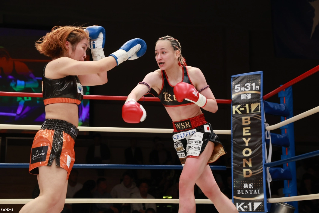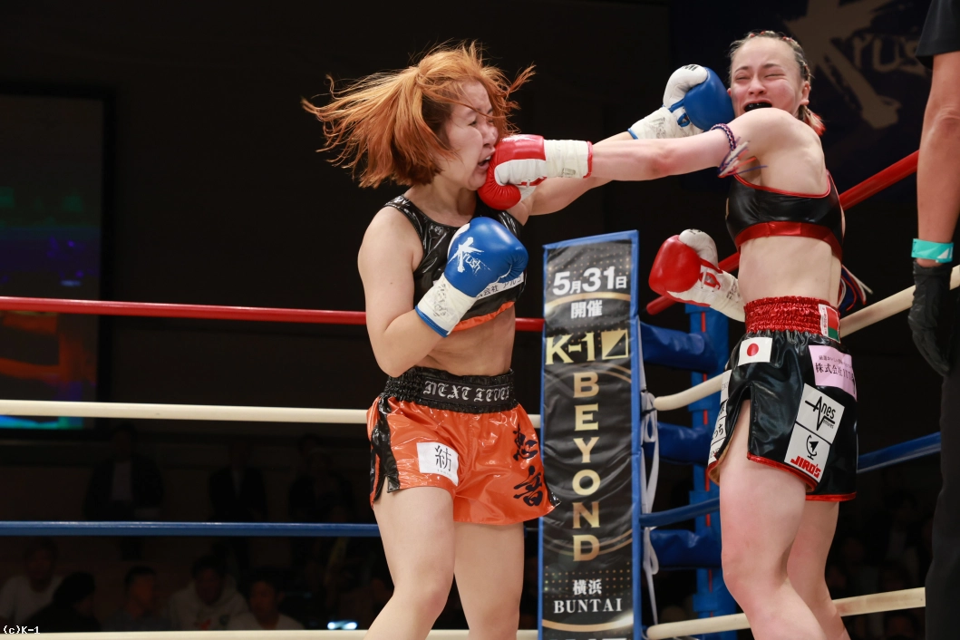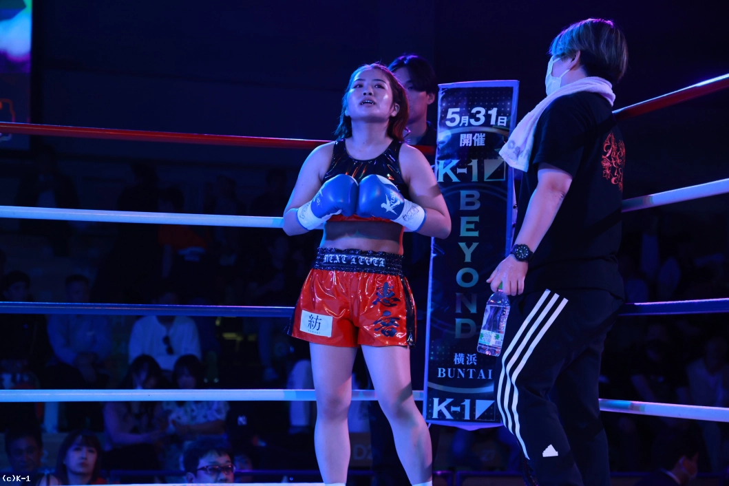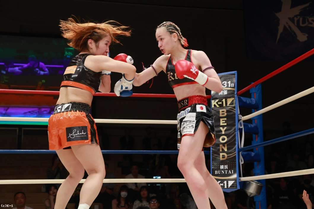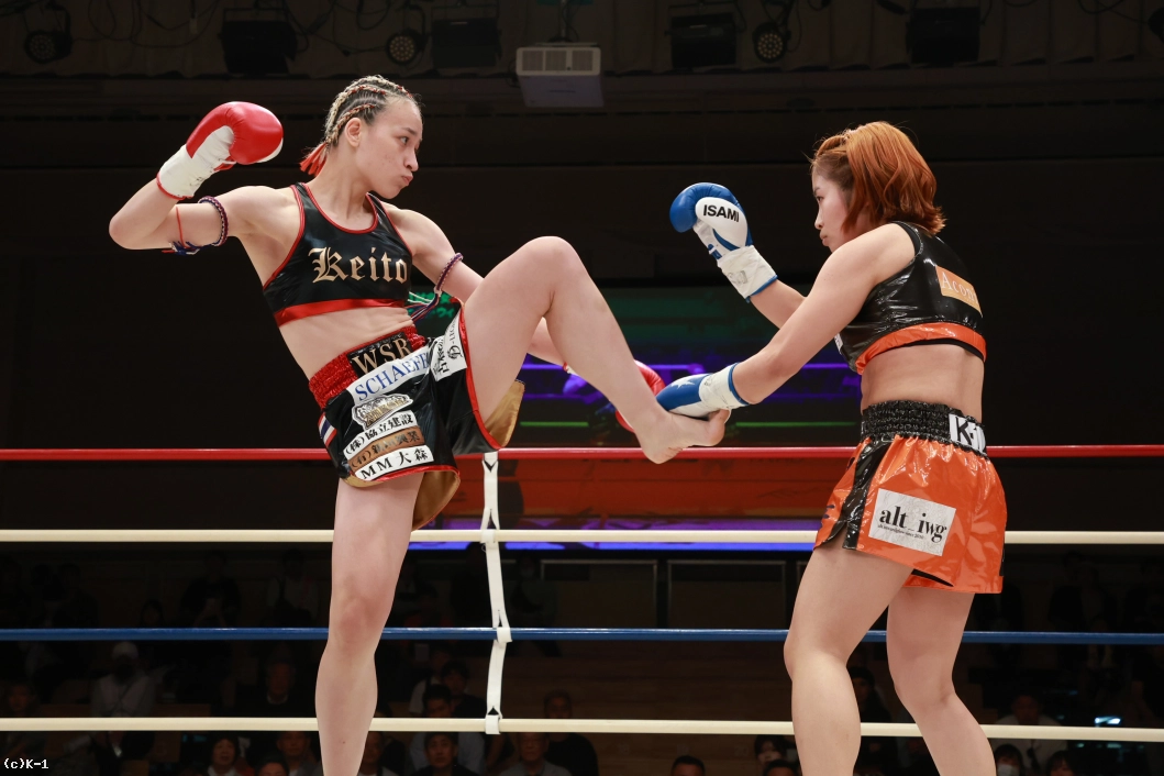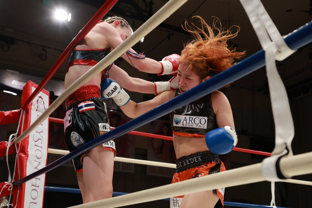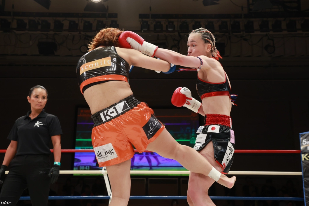 1R、前進する恵音へケイトが左ジャブ、右ミドルを強打。右ストレートで飛び込む恵音の打ち終わりにケイトは右ロー、右テンカオを合わせる。ケイトの左前蹴りで突き放されるも、恵音は前進を繰り返し左右フックを振る。