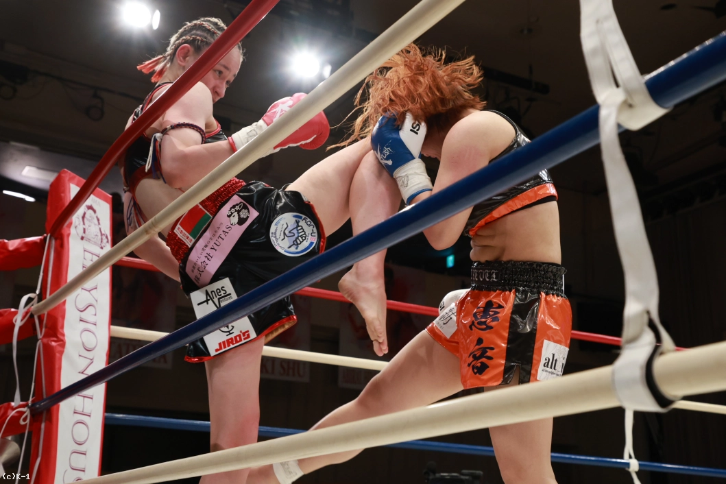 2R、恵音のリーチの外からケイトが右ストレート、右ミドル。恵音は左ローで距離を詰めるが、入り際にケイトが右ヒザを突き上げ、右ストレートを打ち下ろす。常に距離を保ち右ストレートを打ち下ろすケイト。恵音は強引に前に出るが有効打を奪えない。
