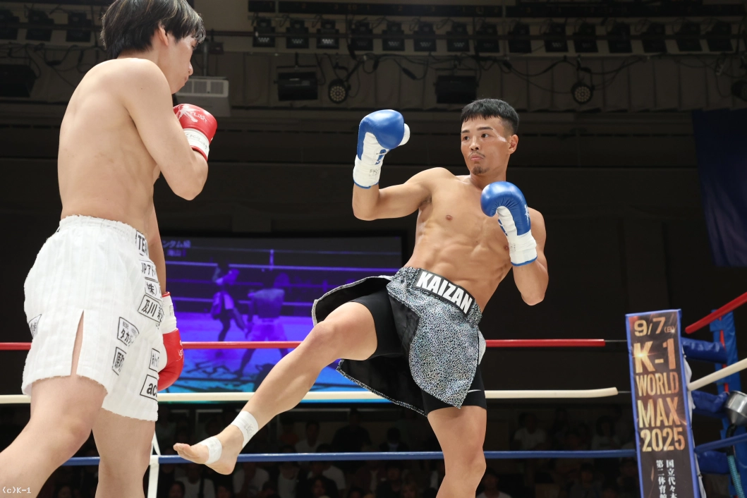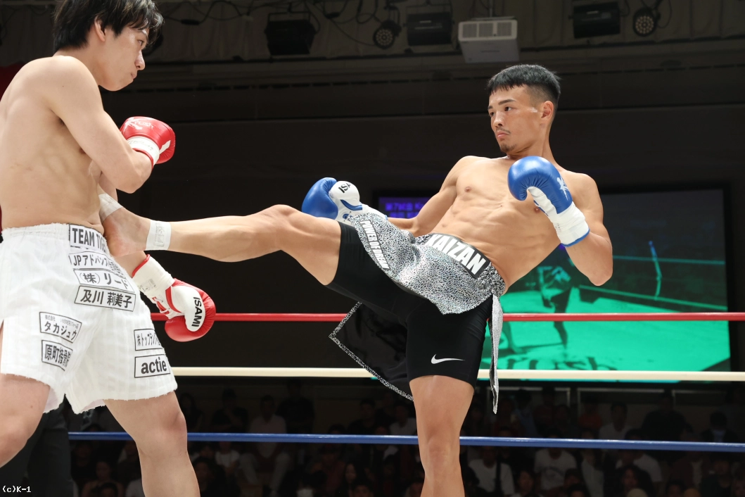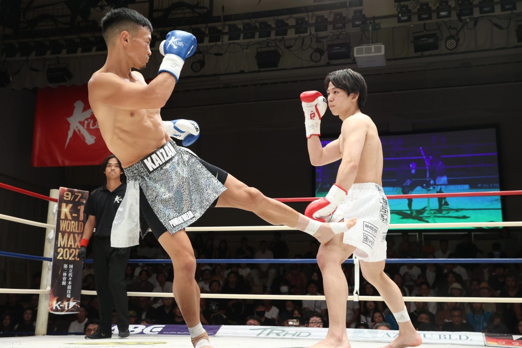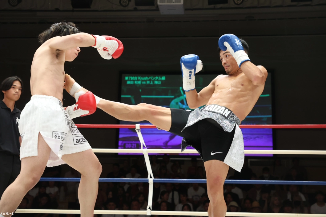 1R、遠い距離から右ローでけん制する井上。スイッチしながら左右ローを繰り出す井上へ、藤田は入り際に左ジャブ、右ローを合わせていく。両者攻め気を見せず静かな立ち上がり。
