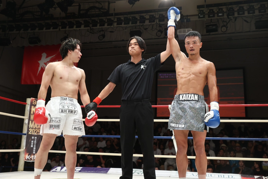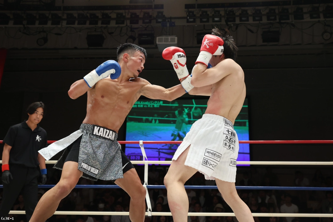 3R、左右へのフットワークを増やす井上。追う藤田は左ミドル、右ロー。井上は藤田の打ち終わりにワンツーを伸ばし、藤田の左フックに右フックをかぶせる。離れ際に井上のバックハンドブローが浅くヒットする。井上が藤田を懐に入れさせないまま終了のゴング。ダウンを奪った井上が判定勝利を収め、連勝を3に伸ばした。