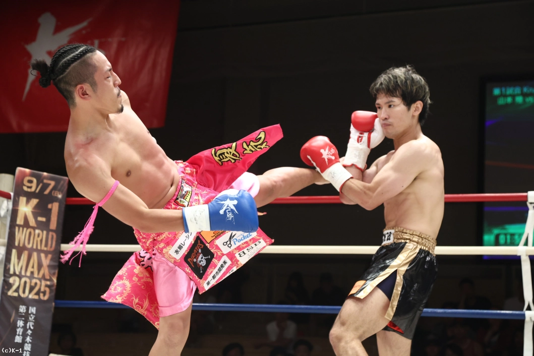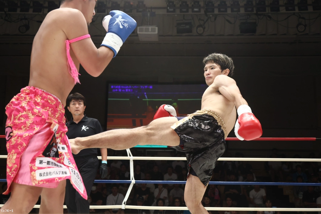 1R、両者カーフの打ち合いから、山本が打ちおろしの右フックをヒット。左ジャブから右ミドル、左かけ蹴りと多彩な攻撃で夏気を攻め立てる。夏気は至近距離で左右ボディを連打するも、打ち終わりに山本の右フックを被弾。山本はラウンド終盤にカウンターの左フックで夏気をぐらつかせる。
