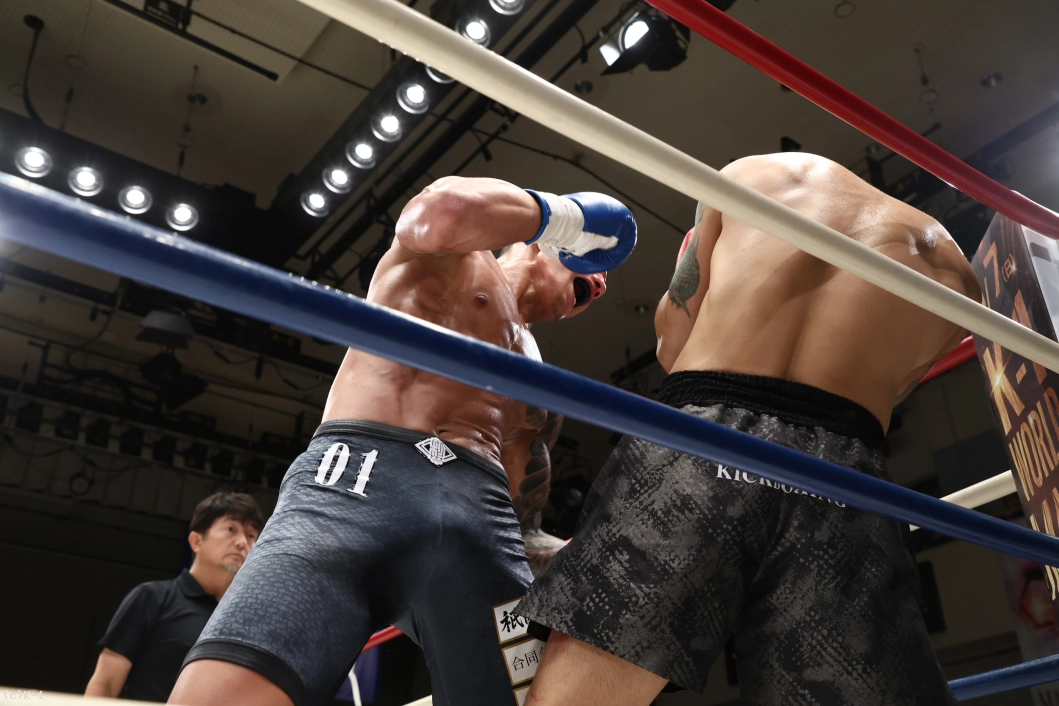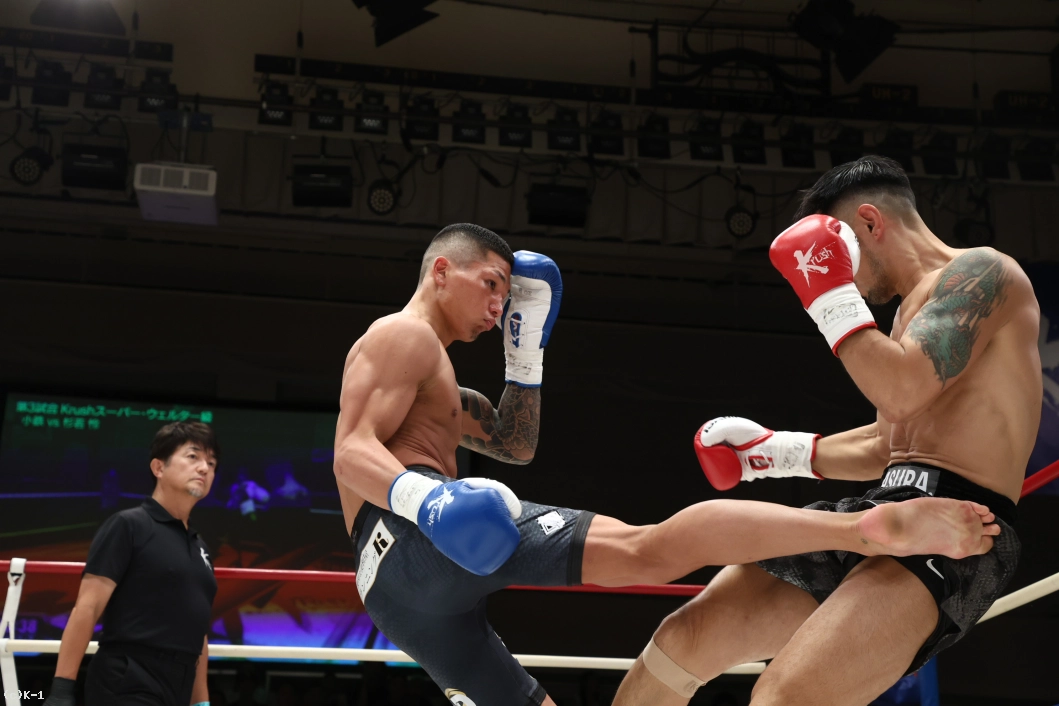1R、杉若の鋭い左ジャブに小鉄が右ローを合わせる。杉若は右の蹴りをカーフ、ロー、ミドルと打ち分け。小鉄は杉若の入り際に右カーフを合わせる。杉若が踏み込み左ボディ。小鉄の右カーフに左フックを合わせ、右ストレートで小鉄をあわやダウンまで追い込む。