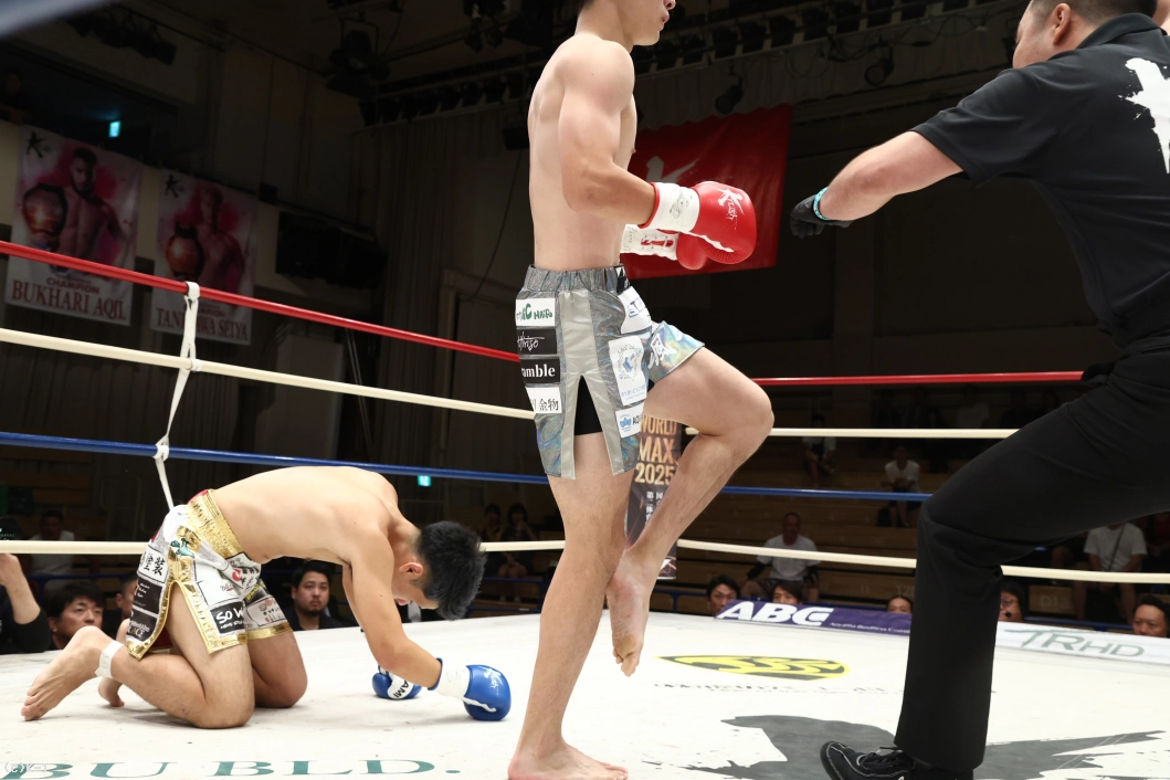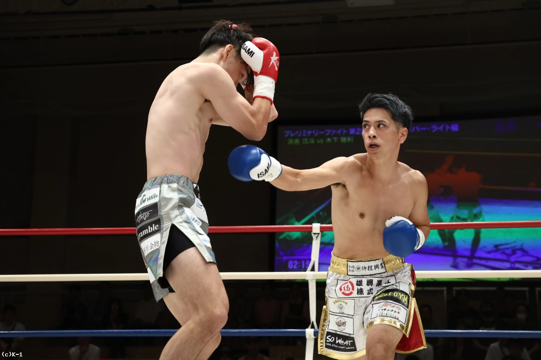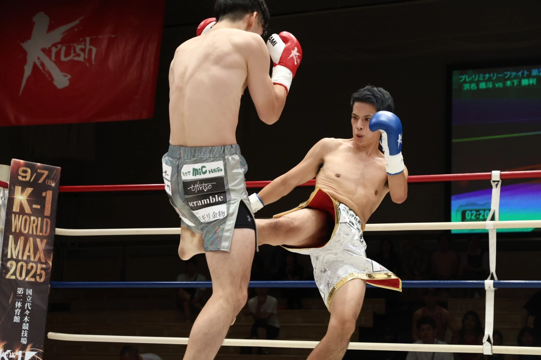 1R、踏み込んで左ジャブを伸ばす木下。浜名は落ち着いた様子で左右ロー。下がる木下へ左ハイで追撃する。右カーフでバランスを崩し木下へ、浜名はさらに右カーフを打ち込みダウンを奪取。立ち上がった直後の木下に右ハイを直撃しダウンを追加。木下がわずか126秒でデビュー2連続KO勝利を飾った。