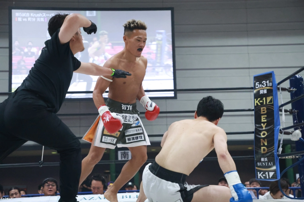 1R、龍はグローブタッチを求める町分に応じず開始からストレートで襲って横向きにさせ、続いての右ストレートでダウンを奪う。立ち上がった町分だがダメージがあり、龍がワンツーから右フックでなぎ倒してノックアウトした。
