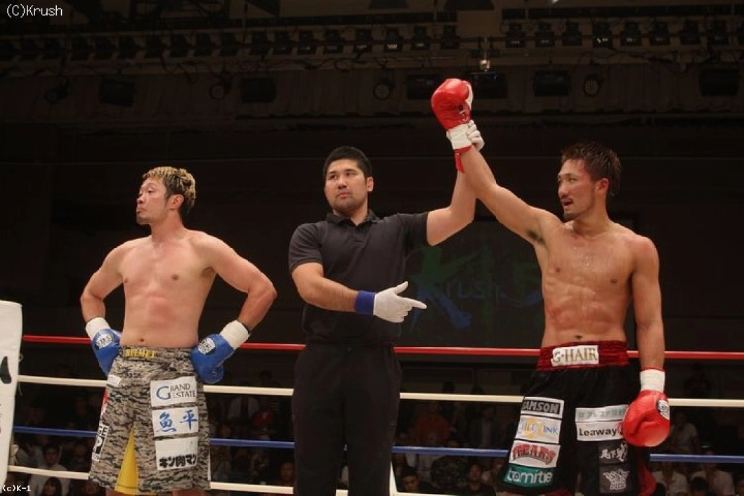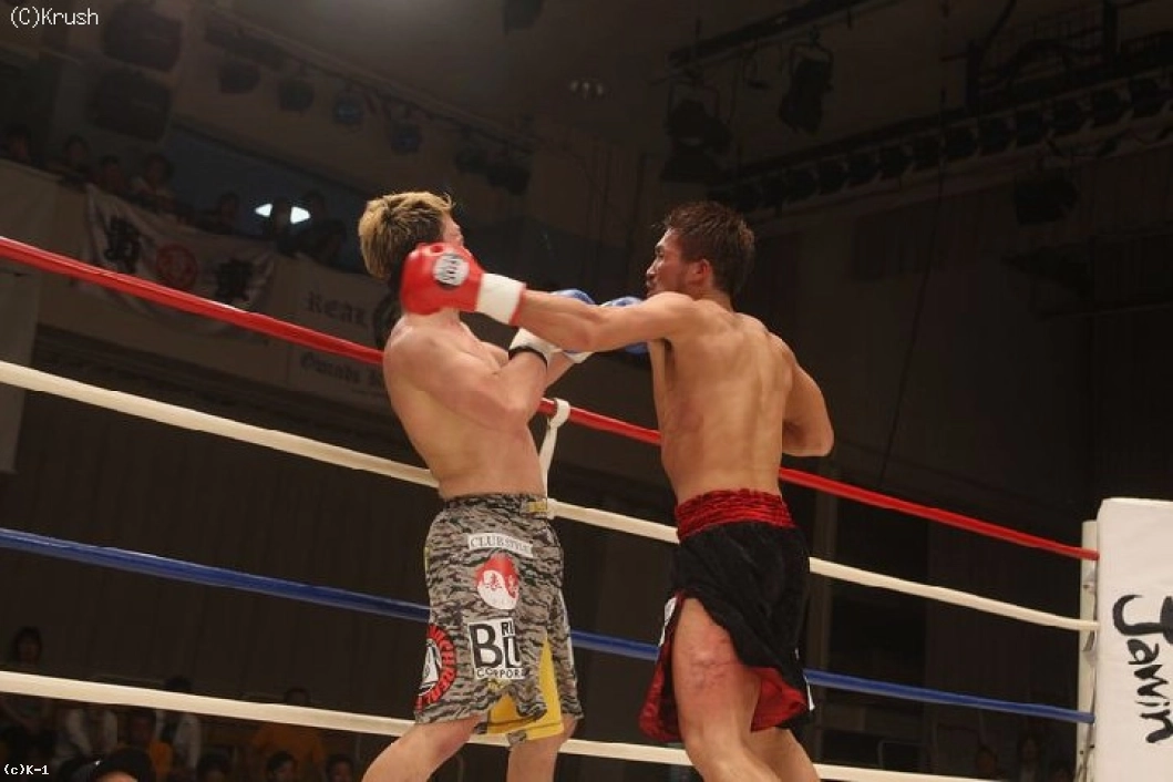 総合格闘家ながらここまでKrush無敗の原田。対する眞暢は63kgに階級を落とし、所属とリングネームを変えての試合となる。1R、サウスポーの原田に対して、眞暢はインローと右ミドル。原田も距離を取りながらアウトローと左ミドルを返す。眞暢は左フックで飛び込み、そこから右ストレートへ。原田の右の蹴りに左フックを合わせ、パンチとローで前に出ていく。