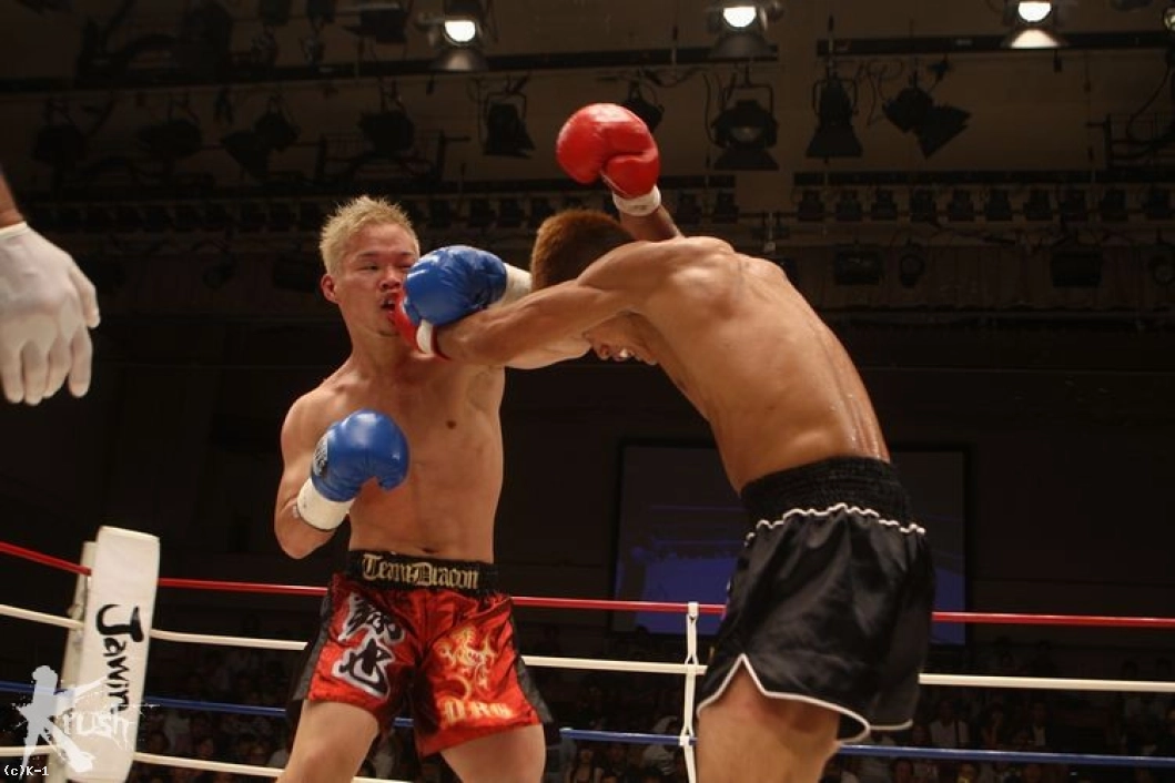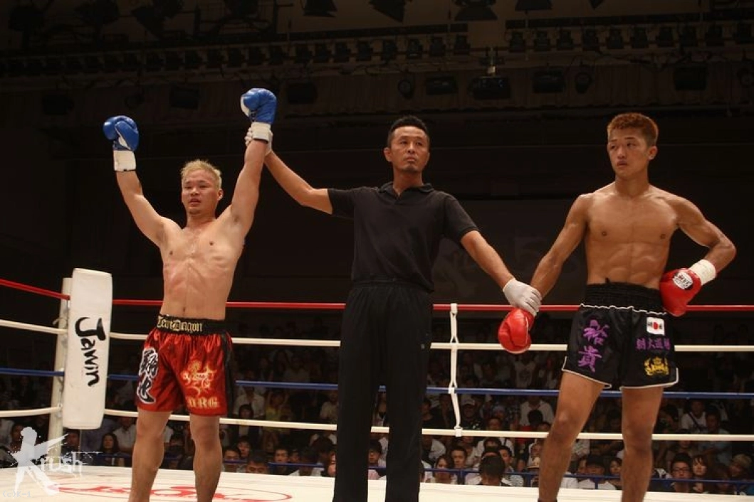 2R、朝久が左ストレート、左ヒザ蹴り、左フックで猛攻。これを耐えた翔也もインローを蹴って左フックから前に出る。距離を取る朝久はバックブロー、インロー、左ミドル。前に出る翔也に顔面前蹴りや飛びヒザ蹴りを狙う。