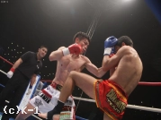 1R、ジャブを突いて右ストレート・右ローにつなげる寺戸。ボテーリョも右ストレート・左フックからハイキックにつなげる。寺戸はしっかりと自分の間合いをキープして確実に右ローを蹴る。