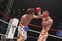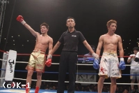 3R、お互いに額をつけて打ち合う両者。久保が距離を作って左ミドルを蹴ると、すぐに距離を潰す左右田がヒザ蹴りを連打する。クリンチが増える展開の中、ここでも左右田の左フックと右がヒット。久保もボディ打ちで応戦するが、クリンチが増えてしまい、久保に痛恨の減点1が言い渡される。再開後、両者が激しく打ち合ったまま試合終了。左右田が久保との接戦をモノにした。
