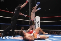 1R、素早いジャブからワンツーを叩き込む木村。HIROYAはしっかりとブロックして右ローを蹴っていく。木村は右ストレートを伸ばして、そこから左フック・左ボディへ。HIROYAは確実に右ローを蹴り込む。木村のパンチとHIROYAのローが交錯する中、木村がHIROYAのローに右ストレートを合わせてダウンを奪う。再開後、木村は左フックからの右、そして左フックで立て続けに2度のダウンを追加し、1RKOでHIROYAをマットに沈めた。