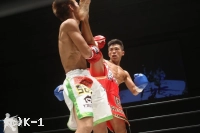 2R、インローを蹴る瀧谷がパンチをまとめて左ハイキック。これで良輝の動きが止まる。瀧谷はパンチをまとめて飛びヒザ蹴りとインロー、そして右の顔面前蹴りでダウンを奪う。再開後、瀧谷は顔面前蹴りでダウンを追加。良輝も必死にクリンチを交えて、瀧谷の追撃を阻止する。