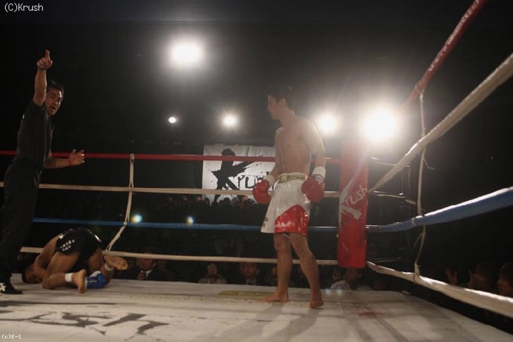 2R、藤橋が浦林の右の蹴り終わりに左フックを合わせてダウンを奪う。再開後、藤橋は左ミドルと左のヒザ蹴りで前に出て、最後は左ストレートをグサリ。これで2度目のダウンを奪うと、何とか立ち上がる浦林だったがダメージが大きく、レフェリーが試合を止めた。