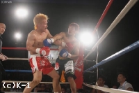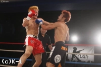 1R、本村はサウスポーの原田の前足に左右のロー、原田もパワフルなパンチと飛びヒザ蹴りで応戦する。じりじりと前に出てローを蹴る本村。原田は左ストレートと飛びヒザ蹴りで飛び込む。