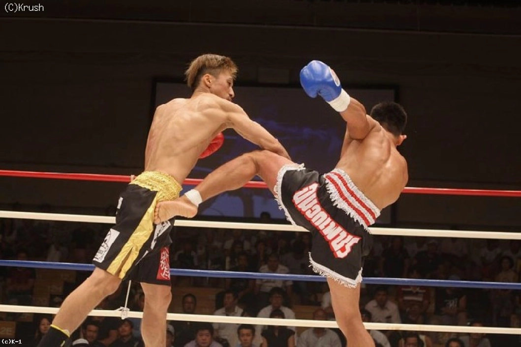 2R、ボディストレートから前に出る結城。ジャブをボディに振って、顔面に右ストレートを打ち込む。闘魔も右を返して左フックで打ち合う。結城が右ボディと左ハイキック、闘魔は顔面前蹴りを突き刺して右ストレートへ。結城は闘魔をロープに詰めて左フックから右ストレートにつなげる。