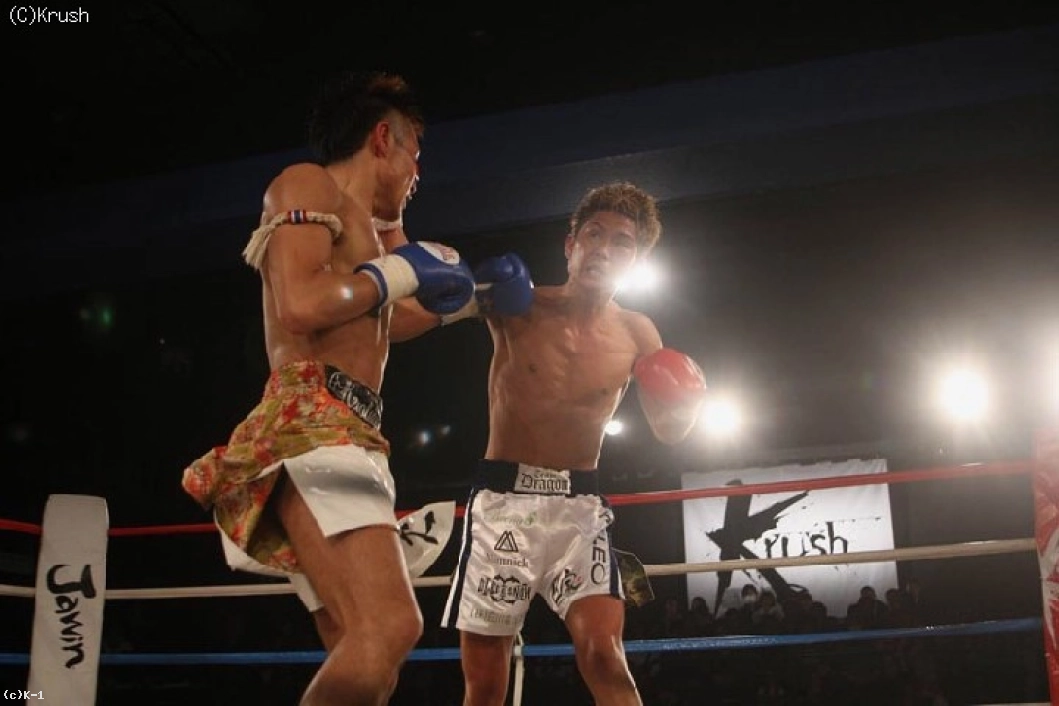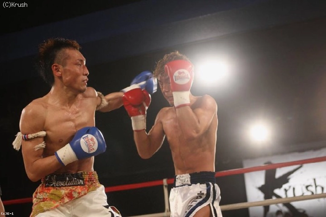 1R、匠が距離を取りながら、一仁が前に出てくるところにパンチとヒザ蹴りを合わせる。一仁は匠のパンチを受けてすぐさま左フック、距離が離れるとローを蹴る。匠は前蹴りで一仁の前進を止めて、鋭い右ストレートからスピーディな連打をまとめる。
