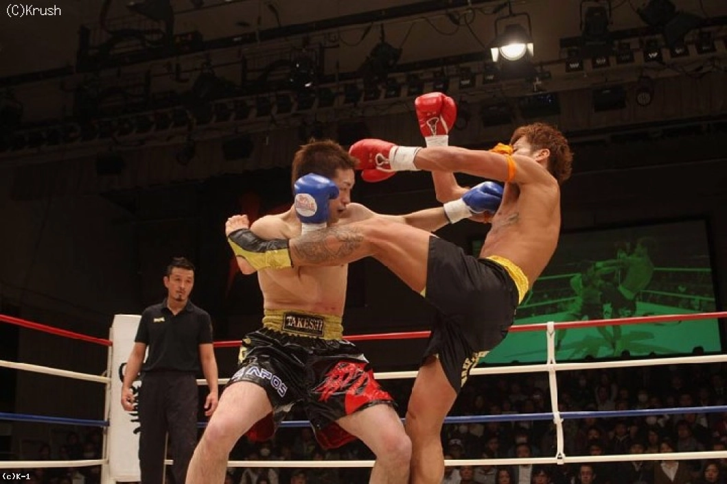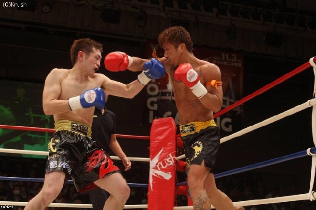2R、渡辺が右ローと右ストレート、細かくパンチを顔面とボディに打ち分ける。闘士はそこに右アッパーから左フック。渡辺は飛びヒザ蹴りも繰り出し、自分の攻撃を当ててすぐに離れる。闘士は右ローを蹴って、パンチの打ち合いで強烈な左フック。終了間際、闘士が渡辺をコーナーに詰めて右ストレートと左ボディを打ち込む。