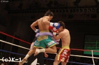 2R、ジャブ・左フックからパンチをまとめる鈴木。飛びヒザ蹴りから右ストレートを当てる。寺戸は左アッパーから右ストレート。鈴木も左ミドルを蹴って右ストレートにつなげる。パンチで前に出る寺戸。鈴木は左ミドルをタイミングよく蹴って、寺戸のローに右ストレートを合わせる。さらに鈴木は細かくジャブを当てて、寺戸が前に出てくると右ストレート。左ミドルと左のヒザ蹴りでボディを狙う。しかし残り20秒、寺戸が右ストレートで鈴木を下がらせて飛びヒザ蹴り。この一発でダウンを奪う。