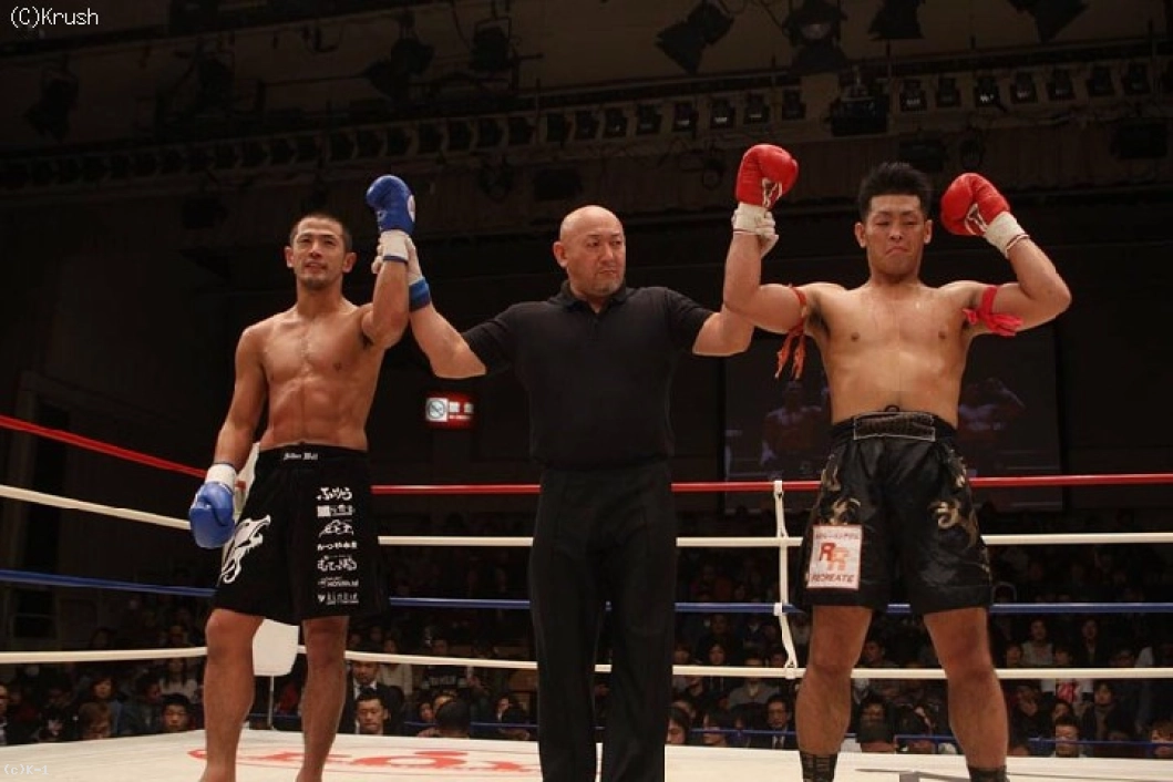 3R、山崎は強引に前に出て右フックと右アッパー。距離が詰まる場面もあったが、堤はペースを崩すことなく左ストレート、ヒザ蹴り、バックブロー。このまま試合終了となり、判定0-0のドローとなった。