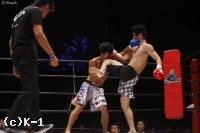 2R、富平は右ミドルと右ストレートで前進。渡部は左ミドルと奥足ローを蹴り、富平がパンチで追いかけてきたところにバックブローを合わせてダウンを奪う。再開後、右フックで前に出る富平。渡部は距離を潰してヒザ蹴りを狙うが、そこに富平が左右のフックを打ち込む。