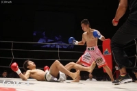 2R、距離をとりながらインローを蹴る瀧谷。戸邊が右ストレートを打つと、瀧谷も左ストレートを返す。瀧谷が距離をつぶして左フック、さらに顔面前蹴り。戸邊も右フックを返して打ち合う。戸邊は右ミドルとヒザ蹴りでボディを効かせ、瀧谷も左ハイキックと左ストレートで応戦。戸邊は距離を詰めてヒザ蹴りとパンチでボディ狙う。終了間際、瀧谷の左ハイキックと戸邊のパンチが交錯。ここで瀧谷がスリップ気味にバランスを崩すが、レフェリーはダウンと判断する。