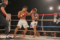 1R、細かくステップしてジャブからパンチのコンビネーションと右ローにつなげる大滝。中嶋も右ローを返して、左フックのカウンターを狙う。ガードを高く上げる中嶋に対して、大滝は左ボディとヒザ蹴り、さらに顔面前蹴りを突き刺す。そして大滝がジャブから右ボディ、そして顔面への右フック。これで中嶋をぐらつかせる。