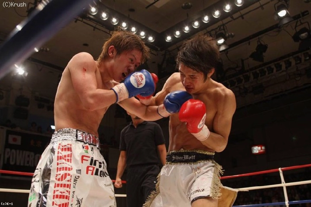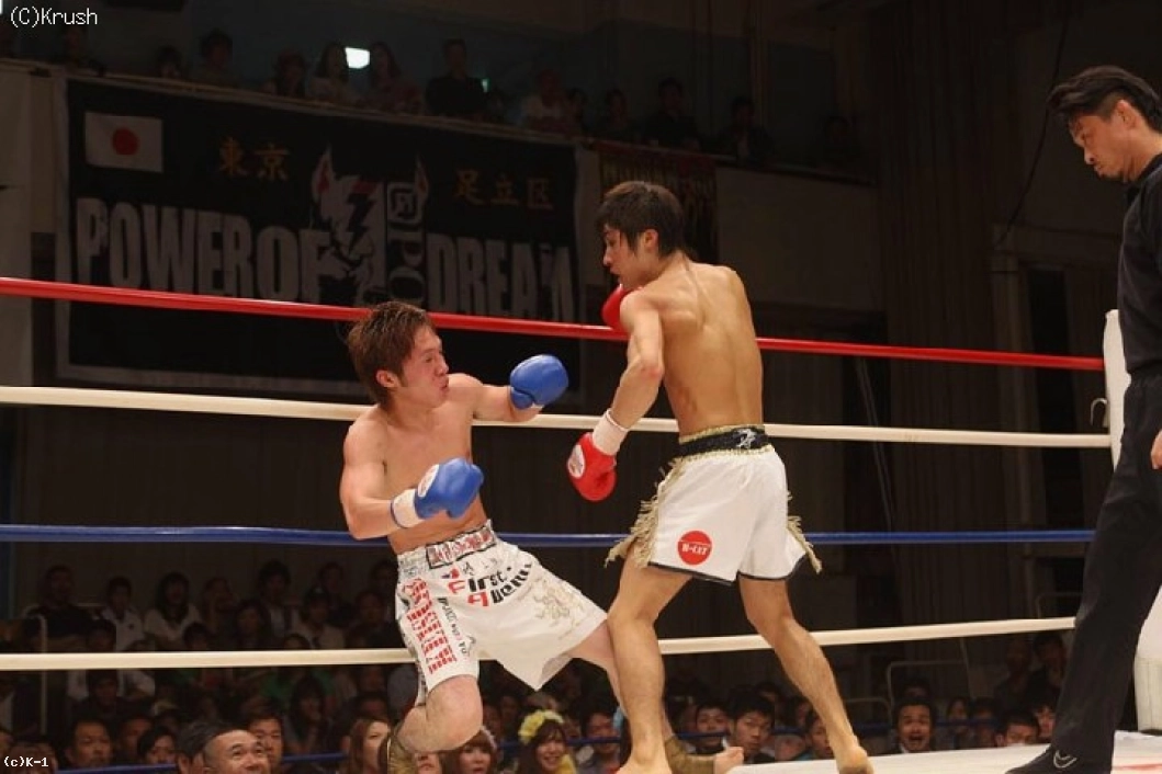 延長R、宮元の蹴りに戸邊が右フック、左フックとヒザ蹴りで前に出る。宮元も距離を取って左ミドルを蹴るが、戸邊は下がらない。そして宮元をロープに詰めた戸邊がヒザ蹴りから右ストレートから左フックと連打をまとめ、これで宮元からダウンを奪う。再開後、頭を詰めて打ち合う両者。戸邊は左右のボディ打ち、右から連打をまとめる。