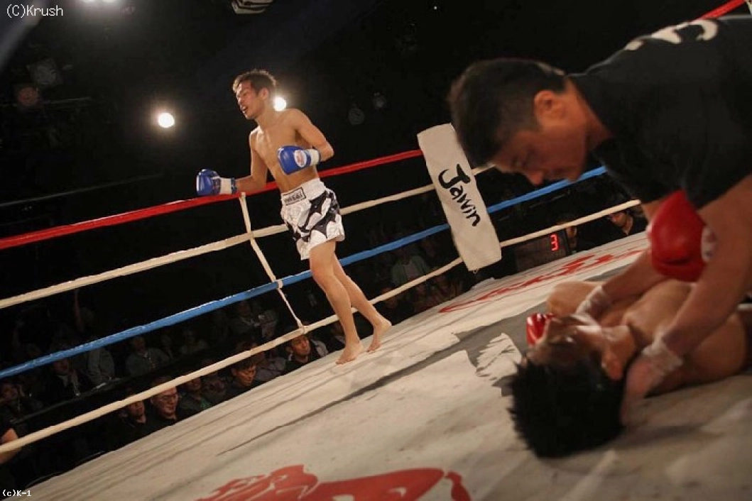 1R、サウスポーの濱田が左ミドル、鋭い左ストレートを突き刺す。林は距離が詰まるとヒザ蹴りを返す。左ストレートと左アッパーで前に出る濱田。林も右ストレートを当ててパンチを返すが、打ち合いの中で濱田が左ストレートと右フック。これで林がばったりと倒れ、濱田が豪快なKO勝利を収めた。