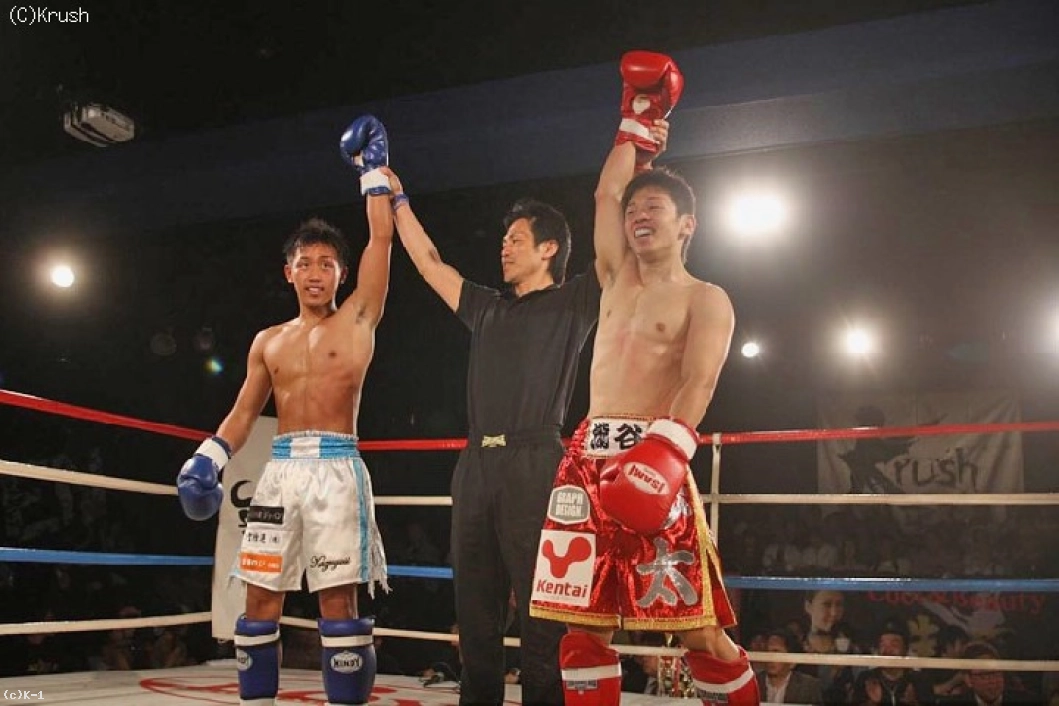 「僕もパンチがめちゃめちゃ効きました。グローブが14オンスで安心していたけど、全然ダメでした(笑)。自分は先週から東京に拠点を移して、KSS健生館の所属として格闘技をやっています。ベルトも返上して一からのスタート、初代のチャンピオン・瀧谷渉太が2代目のベルトも取るのが僕の理想です。kazyosi選手、匠選手と勢いのある選手たちがいますが、2代目のベルトも僕が獲ります。次(7・13新宿)はエキシビションではなく試合ということで、ふぬけた気持ちではなく、ぶっ倒すつもりで戦います」(瀧谷)