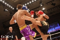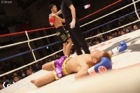 1R、サウスポーの功也に対して、大沢が前蹴り。一気にプレッシャーをかけると、功也の左ミドルにカウンターの左フック。これが見事に決まり、大沢が先制のダウンを奪う。立ち上がった功也は一気に前に出ていくが、大沢も右ボディ。功也は大沢を突き放して左ミドルを蹴る。